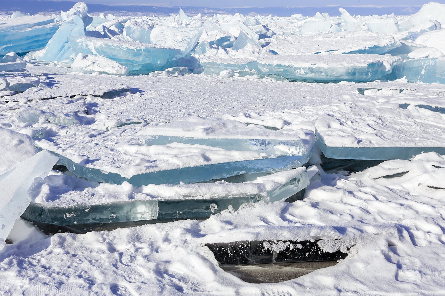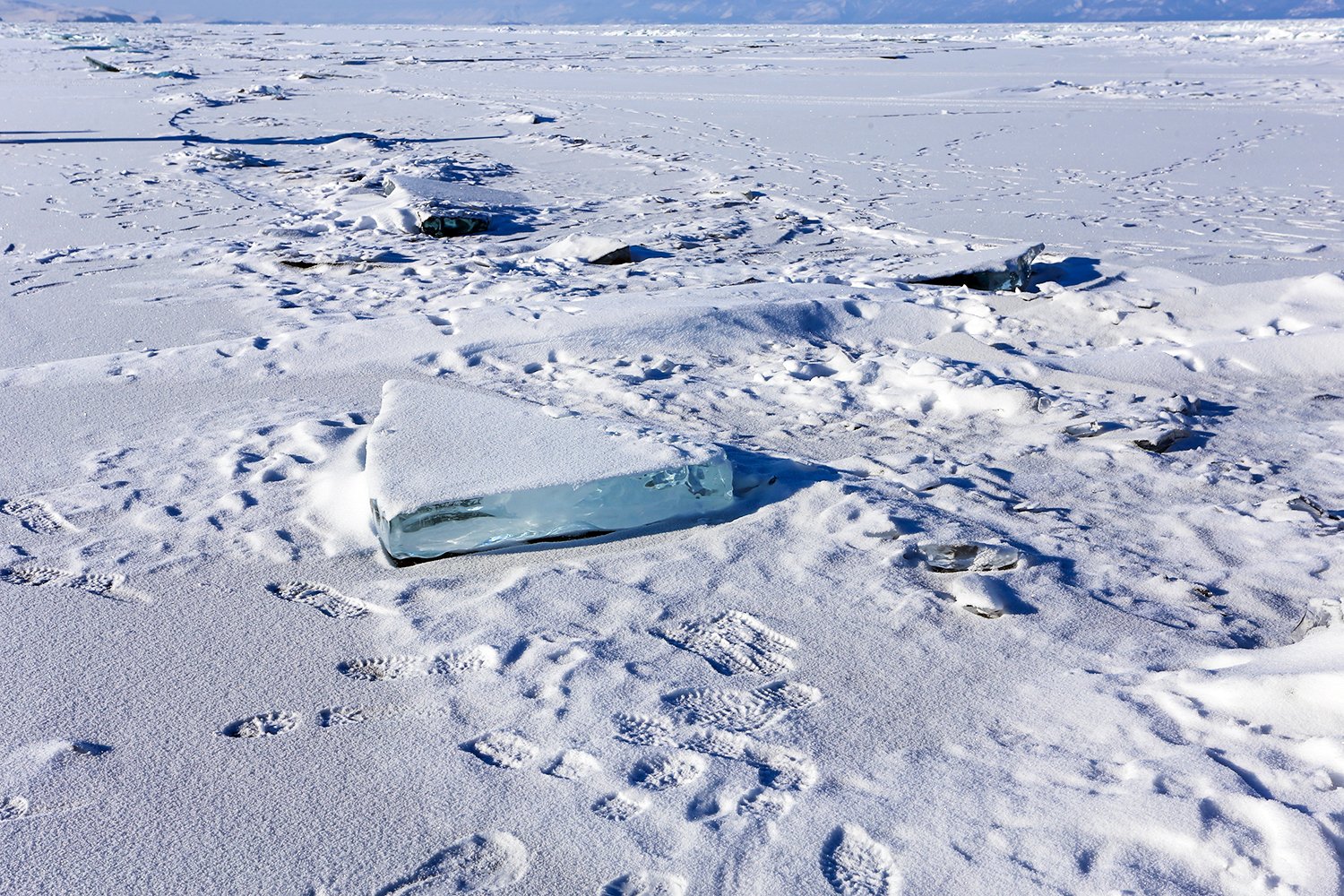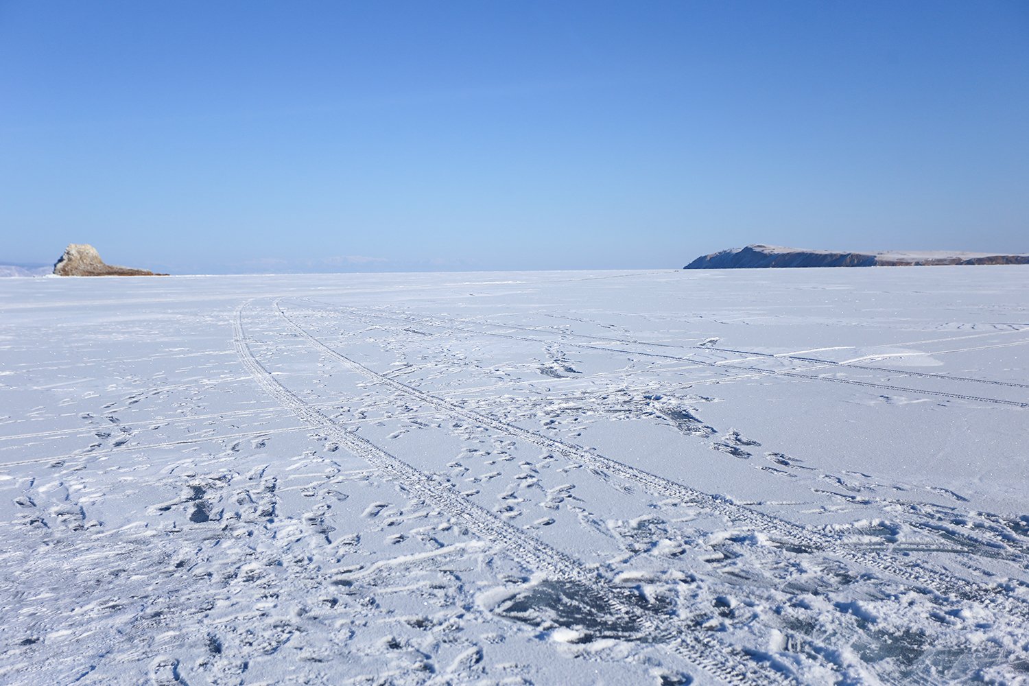 车开过的地方雪化开了,可以看到下面的冰面,都是裂缝。