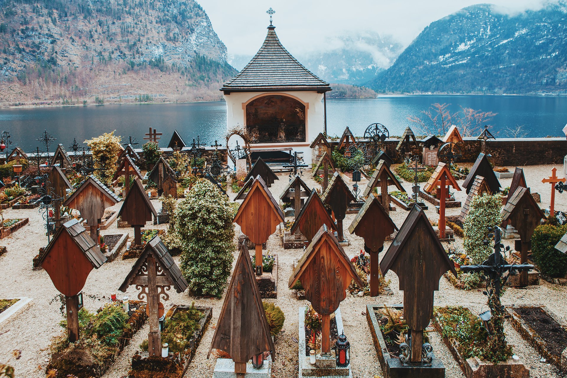 哈尔施塔特 人有一个独特风俗, 由于小镇依山傍湖,寸土寸金,所以埋葬方式是特别。所有逝去的人在埋葬10年后骸骨都将由死者亲属移出坟墓,放到山上教堂中的纳骨堂。日久 天长 ,这里堆积了骸骨(头骨和大腿骨),成为当地独特的风景。