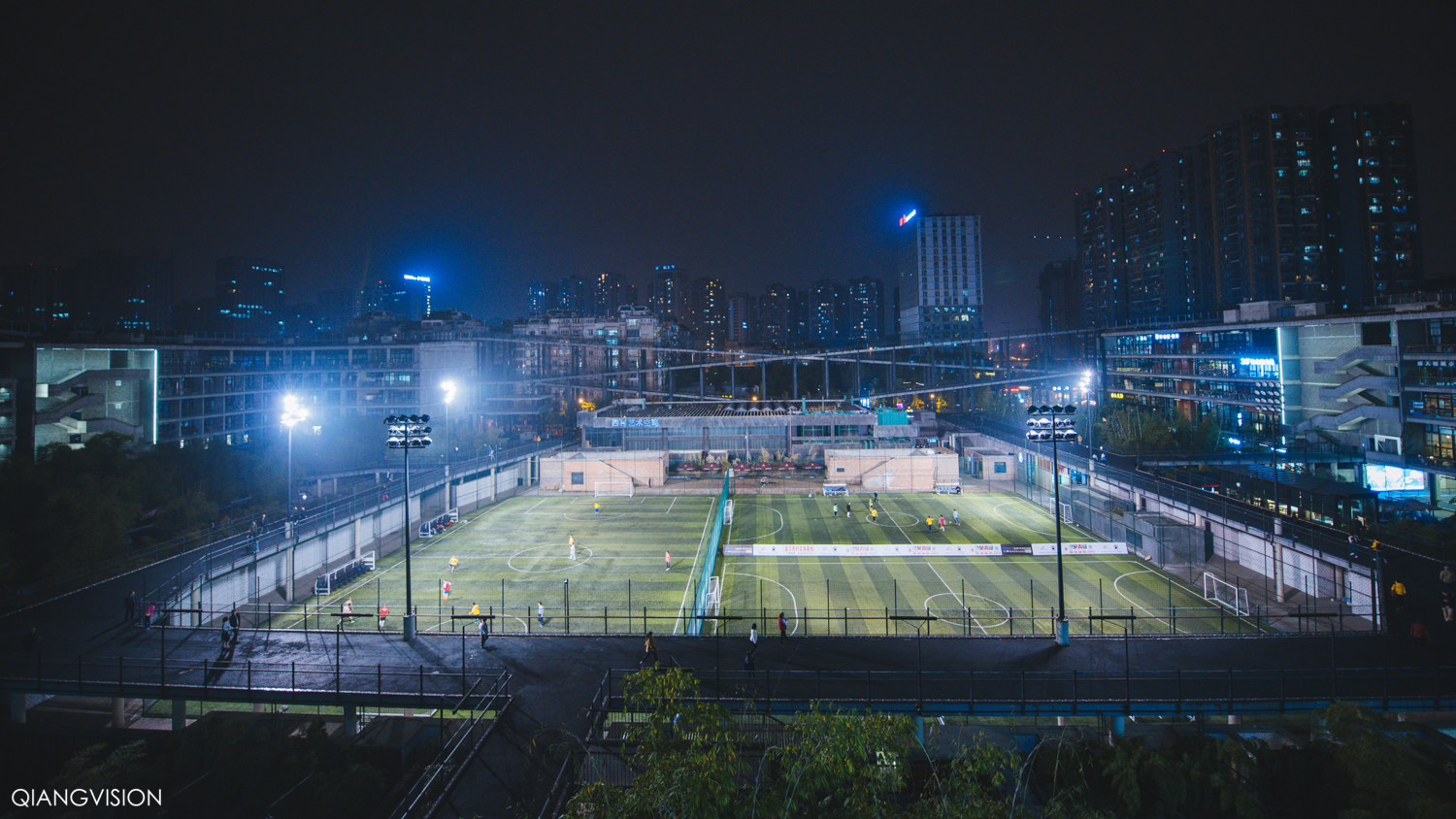 夜色下李伯伯的足球场亮起灯光,球场上奔跑的帅哥让夜晚的西村更加迷人。
