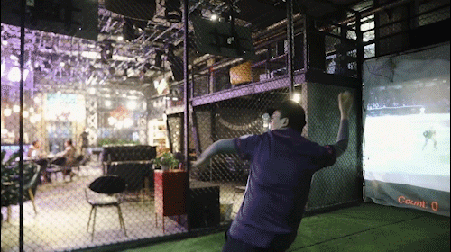 幻灯投影在大屏幕上,一位投球手发球,后面的发球机会实时配合影像发球,一次投币可以体验15次击球的机会,同时高速摄像头捕捉你的动作,进行计分。