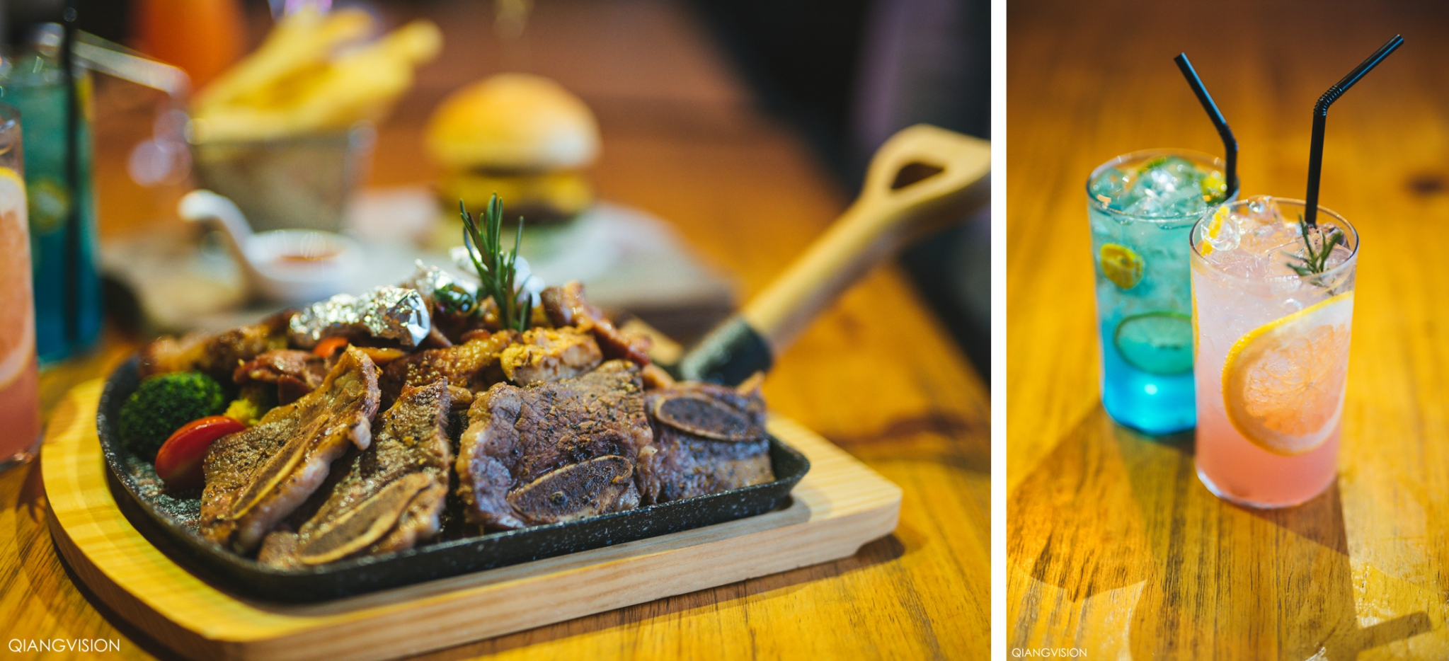 餐吧主打美式西餐, 汉堡薯条牛排,让你在运动之后可以大口吃肉;入座先来一杯高颜又好喝的气泡水,再加一铲铲烤肉拼盘。