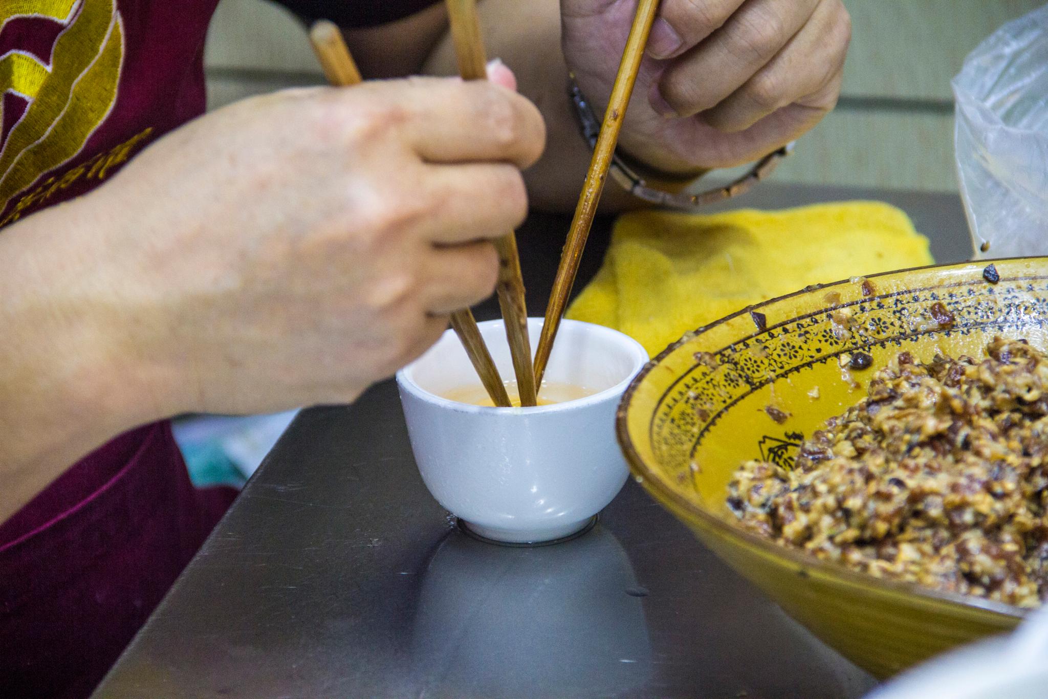 蛋满灌,这还是国家非物质文化遗产呢,将肉馅直接塞入到生鸡蛋的蛋黄中,还要保持鸡蛋完好,这是一项艰难的手艺,店铺门口围观的群众永远是那么多。