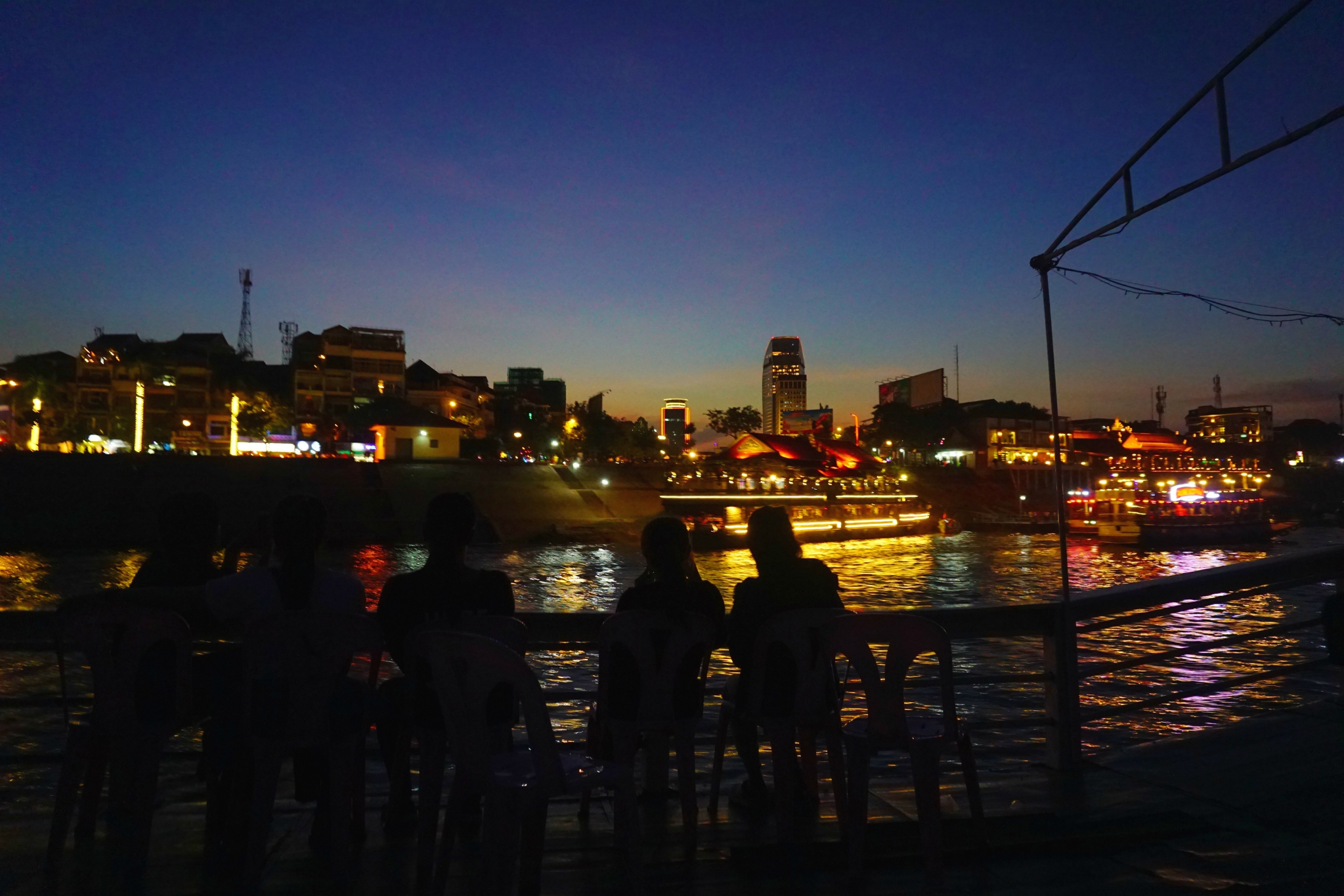夜幕降临,船缓缓地前行,我眺望着两边的夜色。虽然没有广州珠江新城的灯火阑珊,但也算是挺有小资感的。