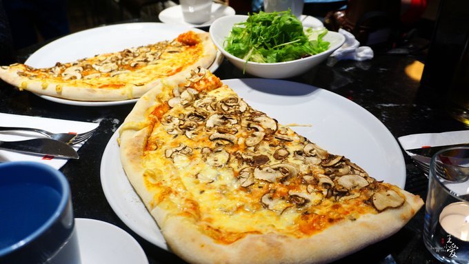 这家L'osteria Salzburg的披萨以分量大闻名,点半份就足够一个人吃了,不过我们刚蛋糕店过来,是也不饿。看着隔壁桌的分量...抠门的四人点了一份蘑菇披萨+蔬菜沙拉+酒鬼闺蜜的酒。合计花费16.5欧,也就是....约132元RMB,实不实在,就好比花了吃沙县的钱,在一家环境还不错的餐厅吃了饭。