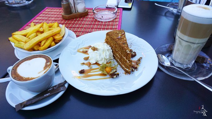 我们点了一人一份的咖啡,薯条是她们的最爱,而我的最爱还是甜品蜂蜜蛋糕。合计消费480捷克币,约160RMB的样子,物价比奥地利来说便宜了一丢丢。