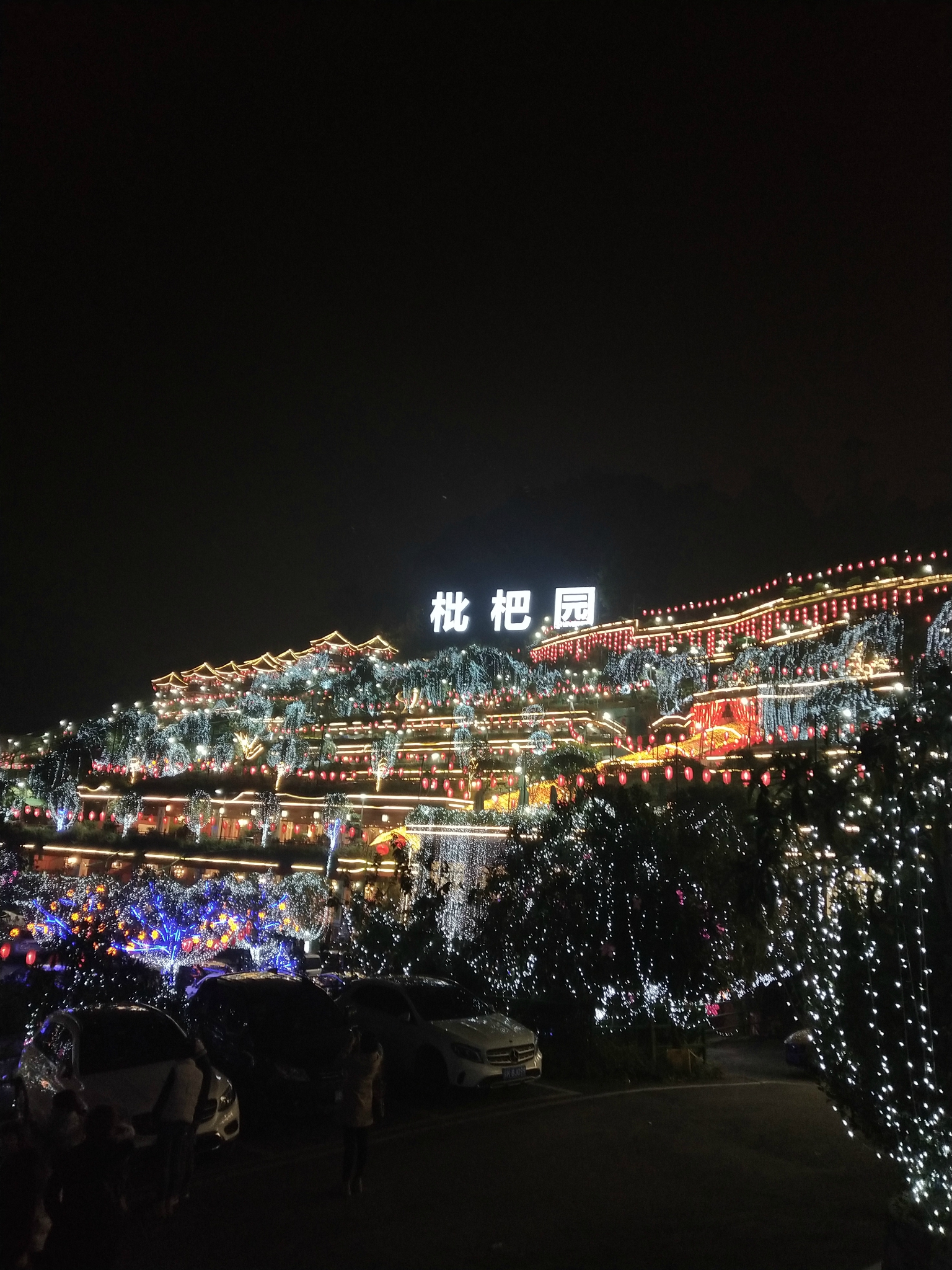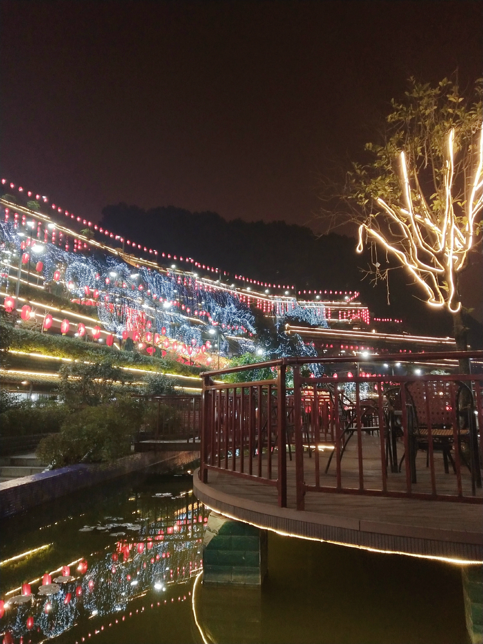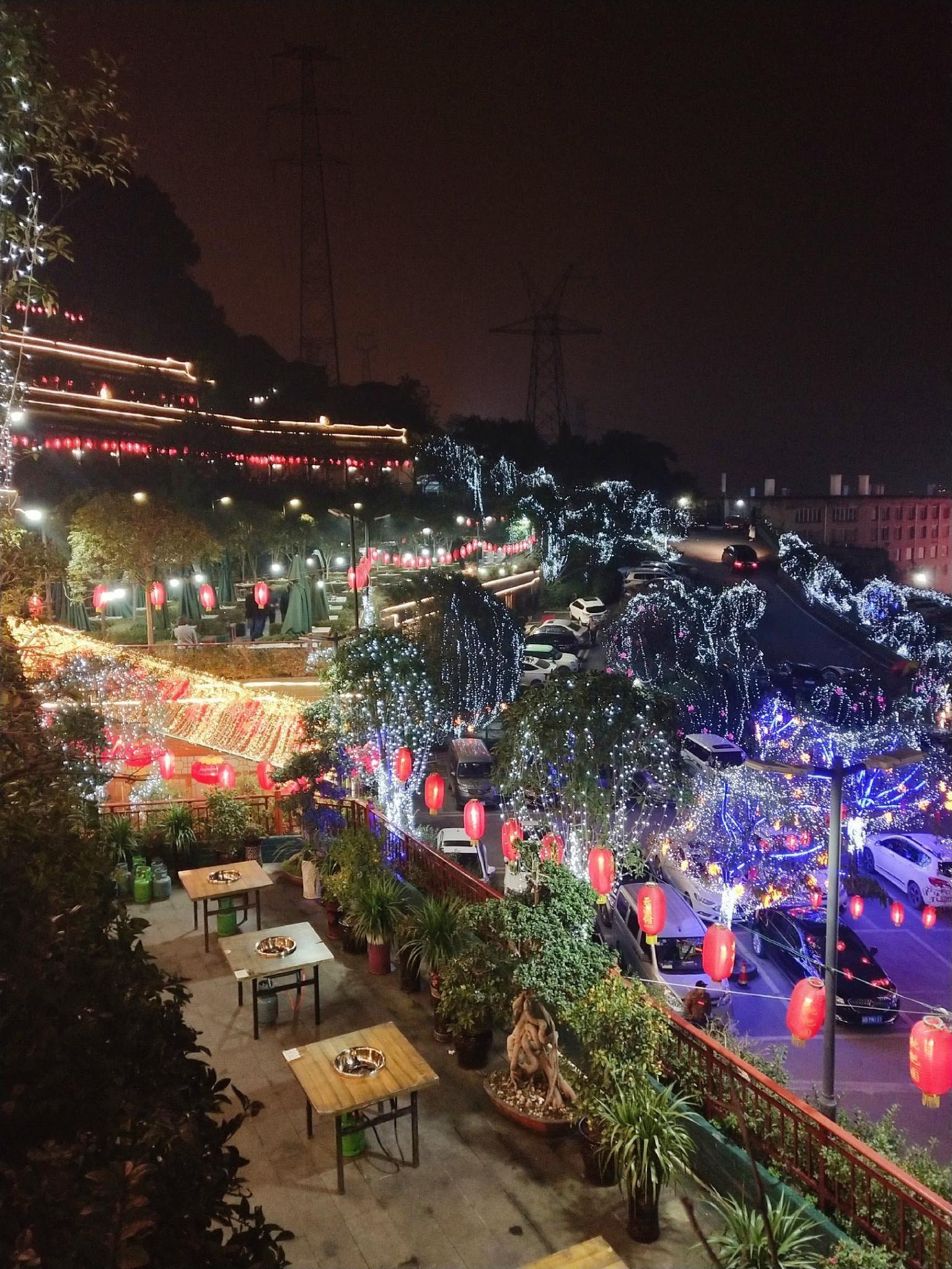 这一条环山而上的路上,有众多规模大小不一的火锅店,都是依山而建,晚上路边、山头挂满的灯笼真的特别漂亮,司机介绍说这一路上的火锅是很出名的,许多外地人来旅游都会来这边,他们当地人来的反而不那么频繁.....司机说他们当地人更热衷于去那些老火锅店.....