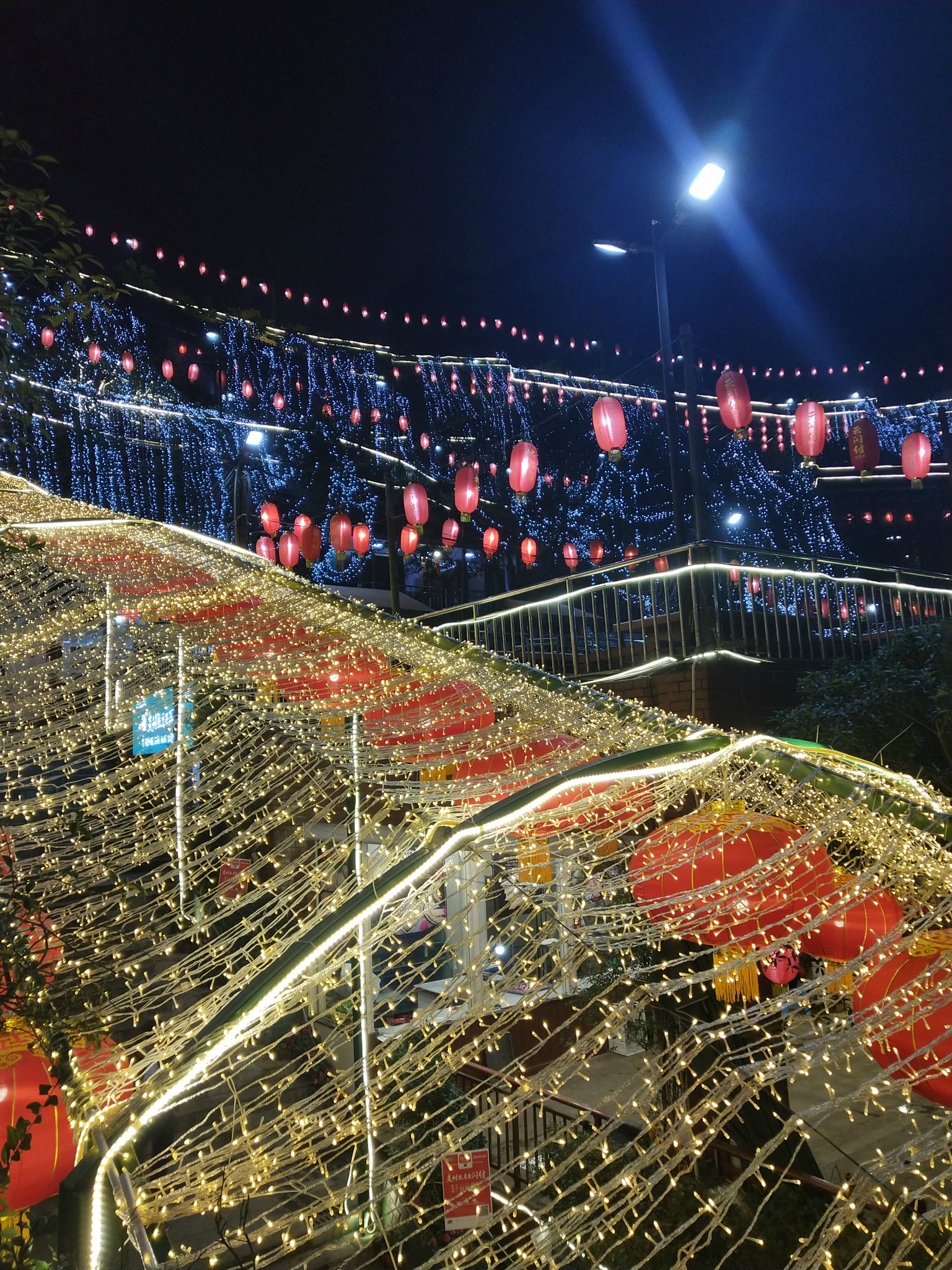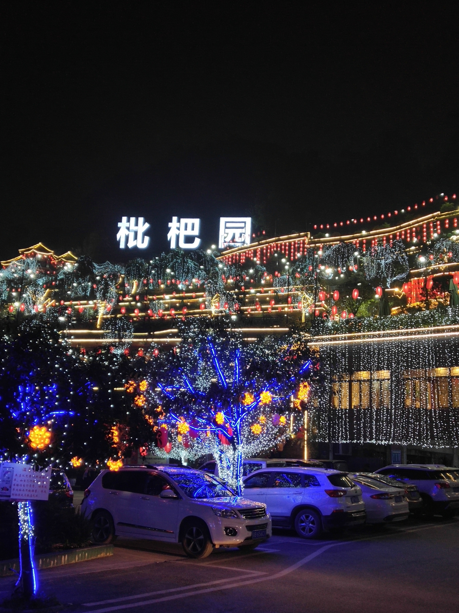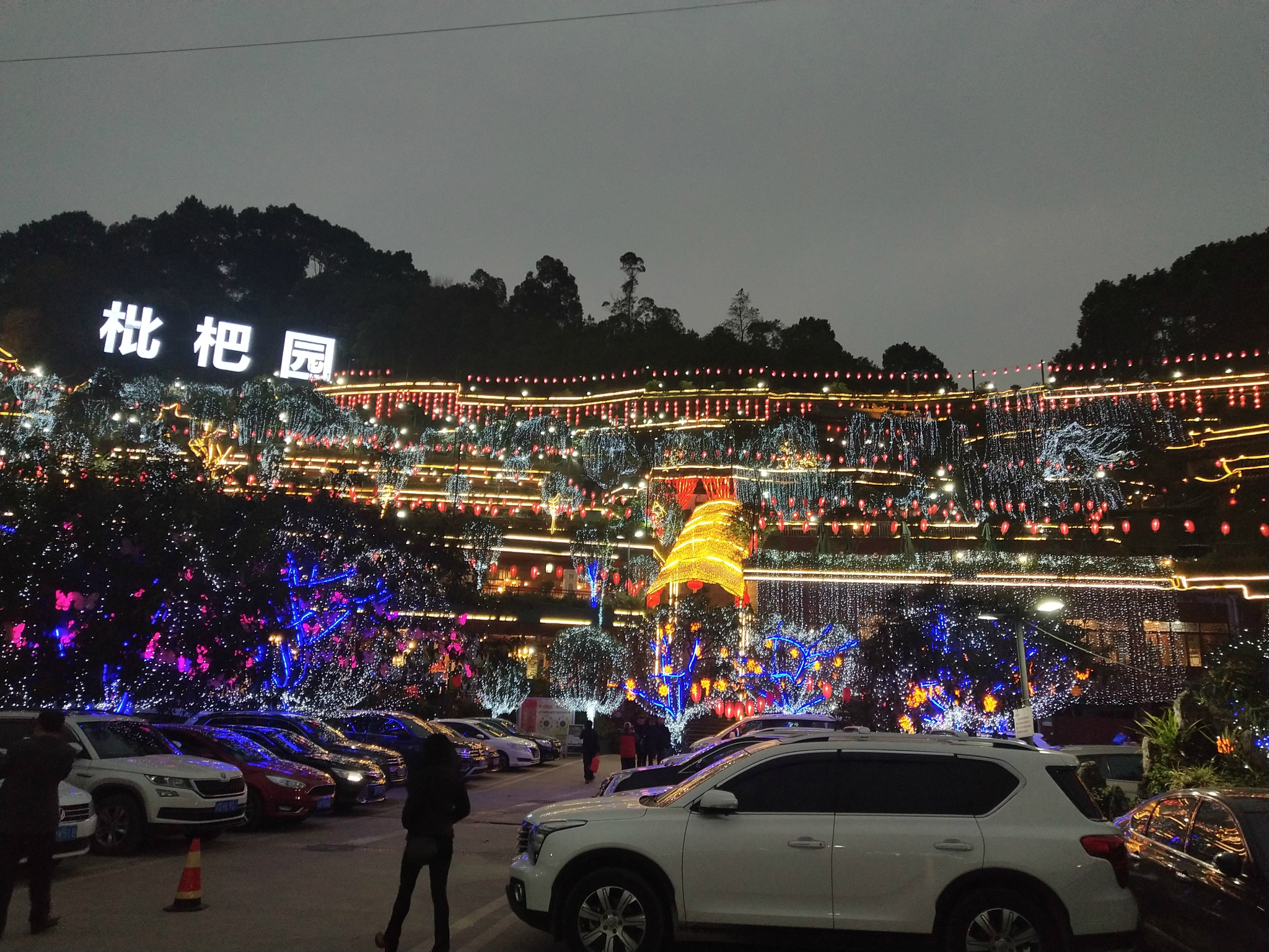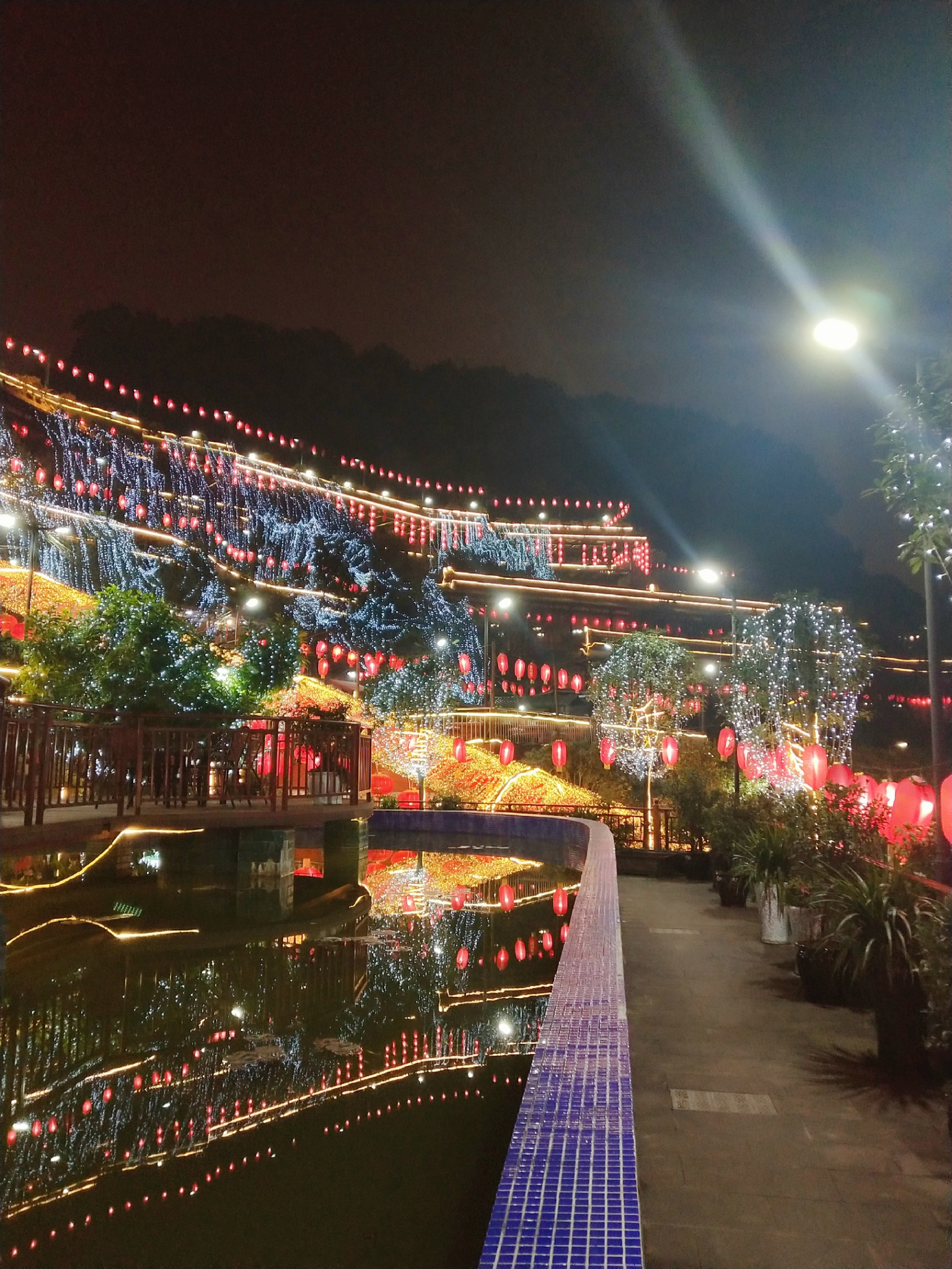 这一条环山而上的路上,有众多规模大小不一的火锅店,都是依山而建,晚上路边、山头挂满的灯笼真的特别漂亮,司机介绍说这一路上的火锅是很出名的,许多外地人来旅游都会来这边,他们当地人来的反而不那么频繁.....司机说他们当地人更热衷于去那些老火锅店.....