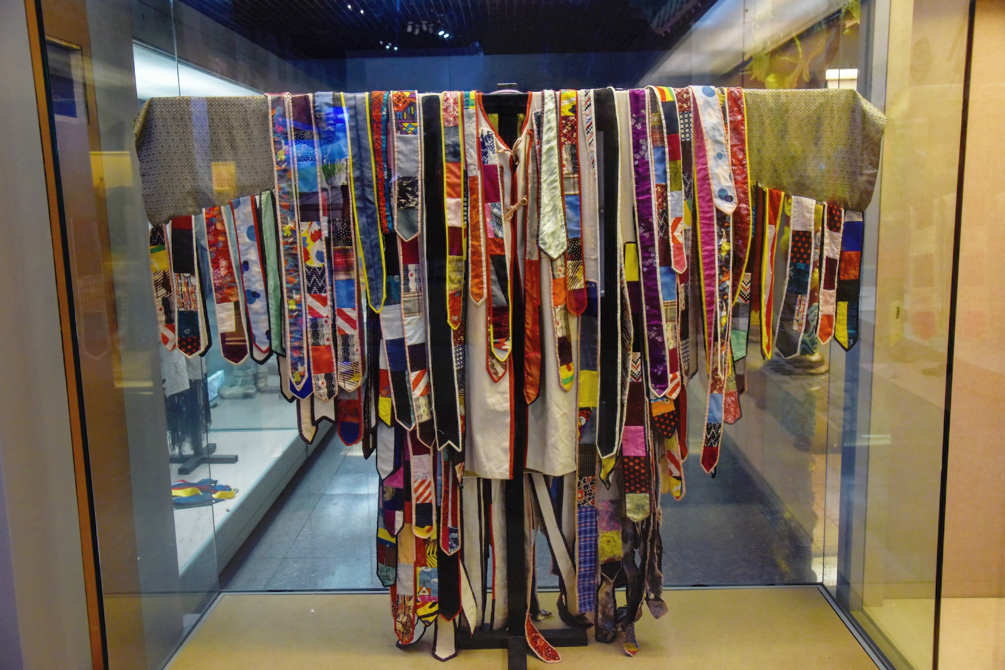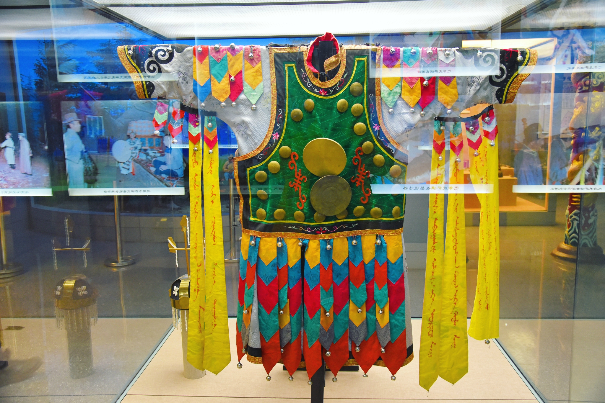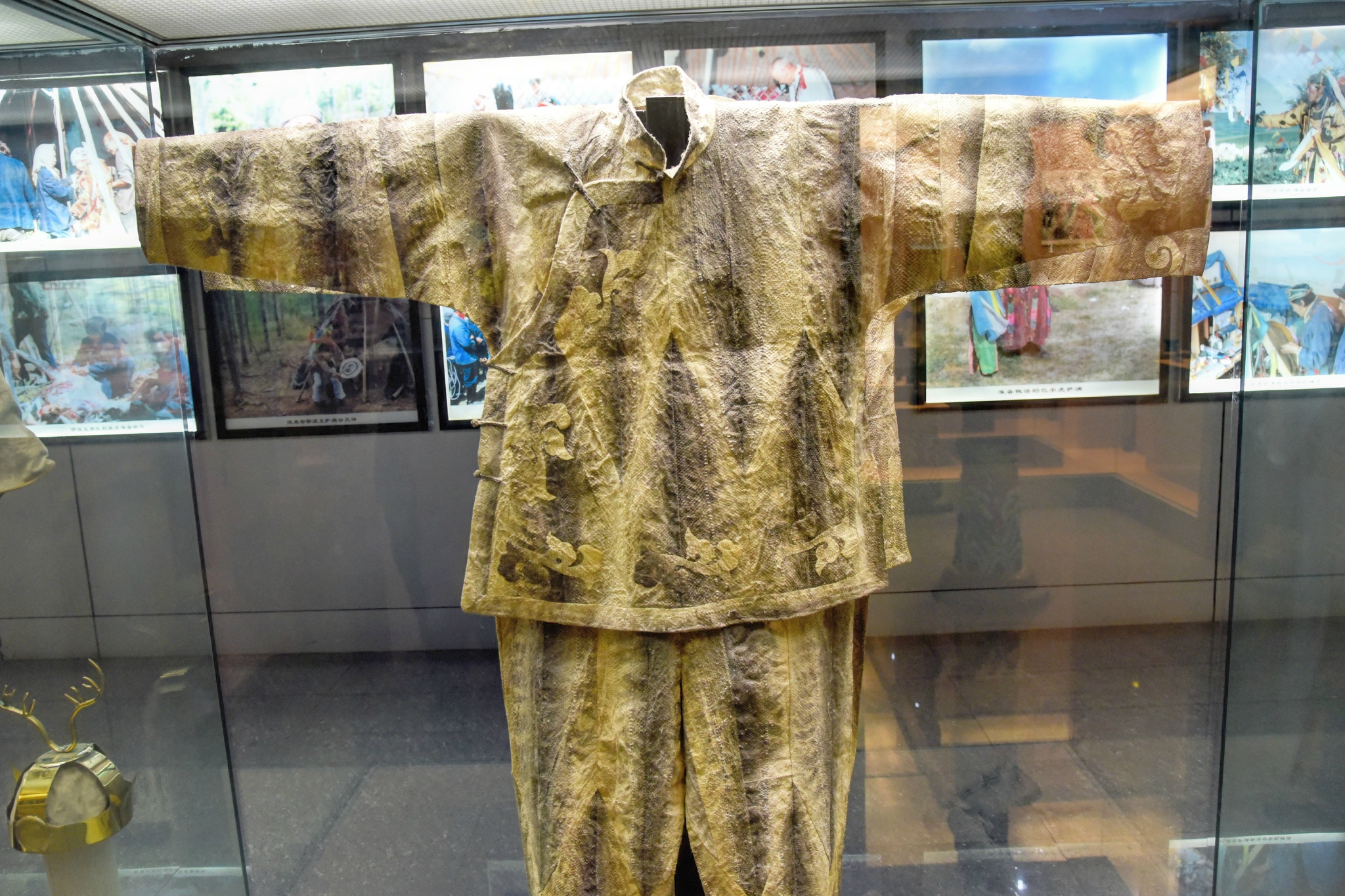 展品除了成吉思汗的金顶大帐,最喜欢的就是祭祀用的衣服了,色彩鲜艳,极具民族特色,特别是下面第一件,看似没有其他衣服那么花哨,感觉不起眼,其实恐怕是全场最难做的衣服了,因为它是用鱼鳞慢慢制作而成,不得不佩服其精湛的工艺。