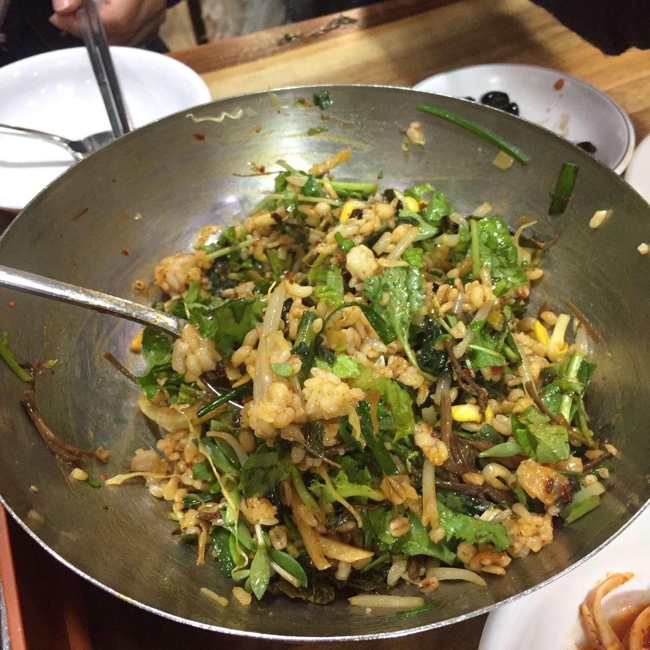桌上不锈钢盆(姑且用盆吧),就是韩式拌饭摊位哟。 蔬菜都很新鲜,都是当日新鲜蔬菜。