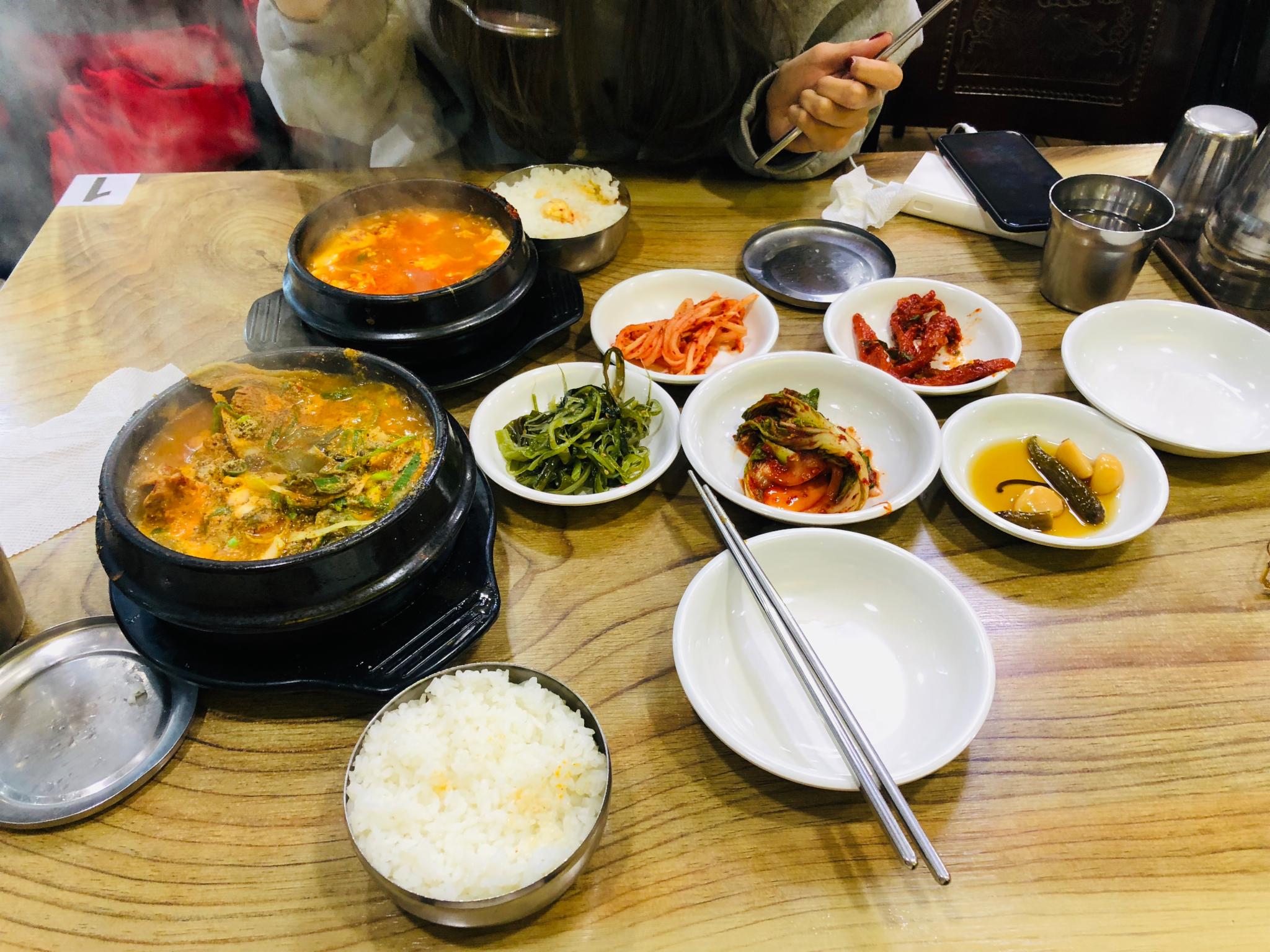 脊骨汤和泡菜汤。在韩国吃饭,会有很多这样的小菜,我发现吃过的小菜味道都不太一样,据说因为是老板自己酿制的酱料和小菜。