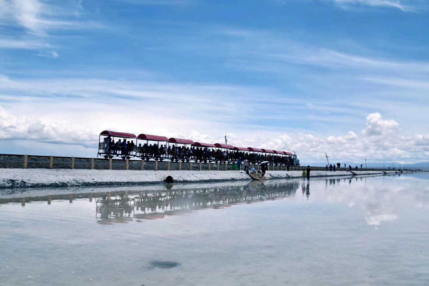 去了茶卡盐湖可以这样玩,方案一:坐环湖小火车进到茶卡盐湖的最深处,然后边拍照边往回逛。(方案一适用于时间不充足又想玩的好的小伙伴)小火车票价50/人,大概坐十几分钟吧。