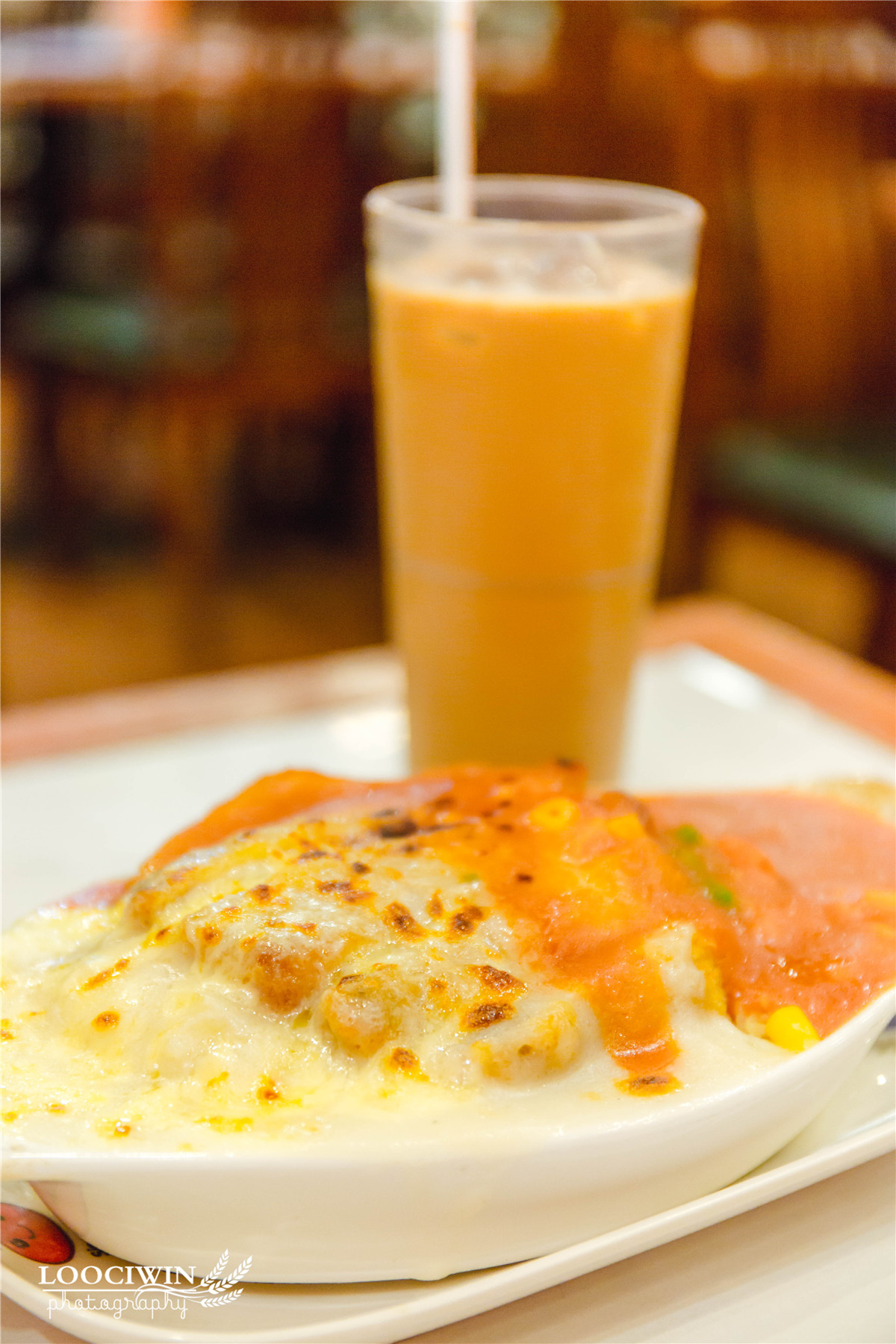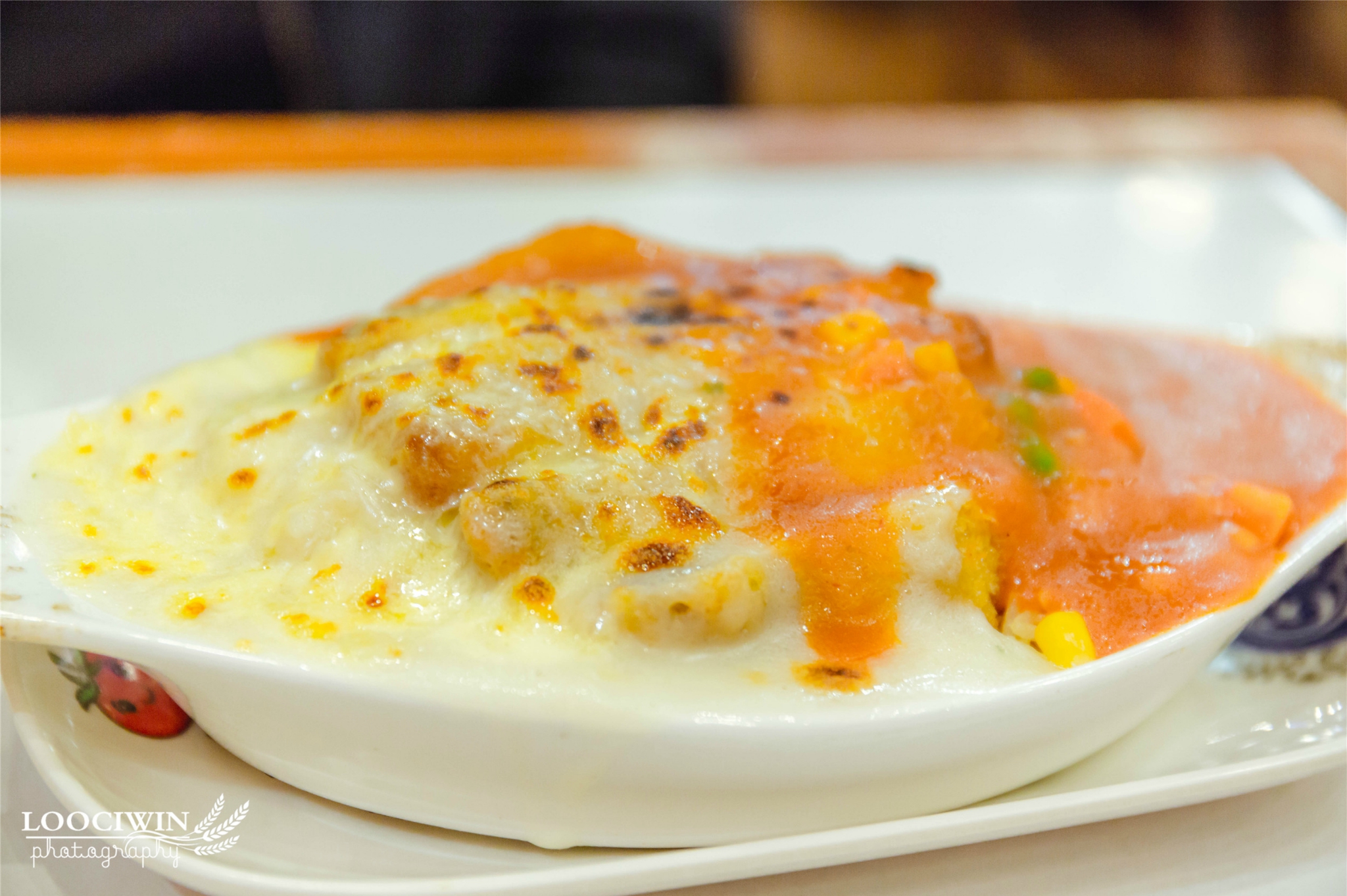 强烈推荐这家店的芝士焗饭系列,如果你是芝士控一定不要错过,满满的芝士融入口中,烤得芝士饭金黄的。我点了一个白汁混搭番茄汁的芝士焗鸡扒饭,味道确实不错。