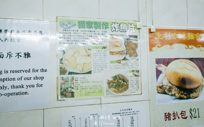 这家餐厅就在玛嘉烈蛋挞店旁边,我们是买完了蛋挞,来这里吃早饭。这家店铺在美食app上显示是20多年老店,看起来还不错,主打炸鱼片和牛腩面或饭、三明治、奶茶等。看店铺墙上写着“全澳只此一家有炸鱼片供应。师傅以秘制材料将鱼片腌制一晚,然后入油,中火慢炸,炸出的鱼片色泽均匀,非常香脆”,看起来是独家制作菜品。