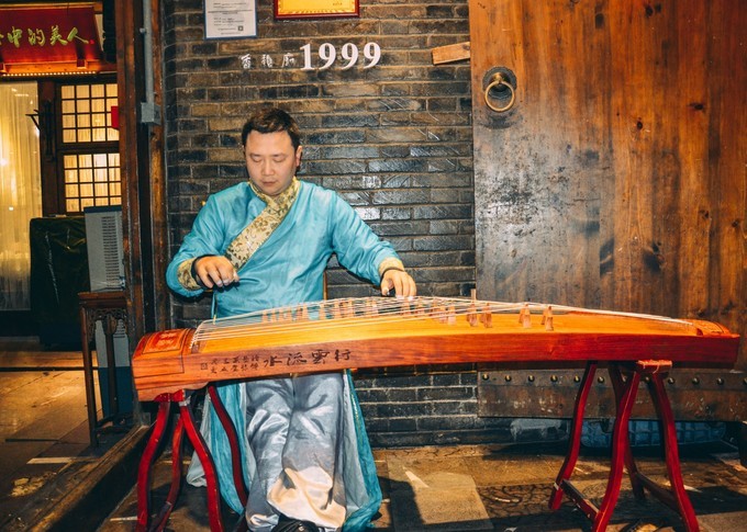 晚饭时分,门口表演的大叔多才多艺,古筝茶艺样样精通。