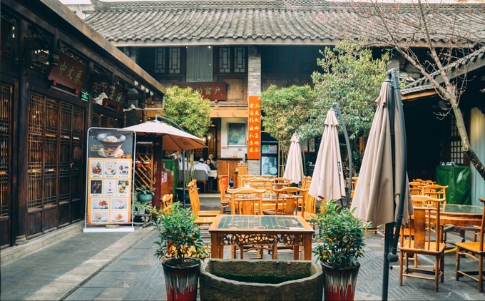 餐厅庭院里有一层户外桌,二楼还有包间,装修的古朴明亮,古色古香的木质桌椅和现代相结合的中式风,环境无可挑剔,还有一种 成都 人民市井生活的风格。