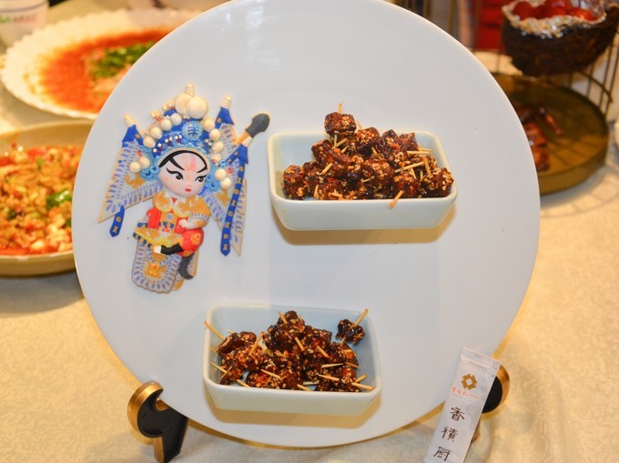 一个镶嵌有川剧人物的大圆盘,感觉这不单是一种美食也是一种文化,放着两碟牙签牛肉,牛肉微带麻辣,咸淡适中干而不硬,在川剧人物的映衬下凸显的 四川 特色真让人拍手叫绝。