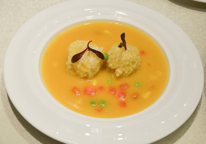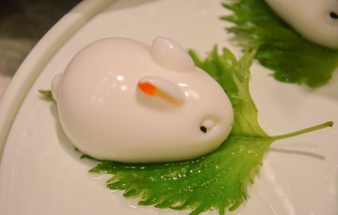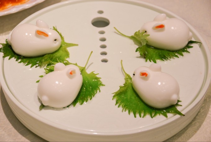 阔爱的小白兔是一道甜品,绿叶衬托着小白兔实在是太可爱了,外面吃着像是椰子味的东西做的,里面是芒果味儿的馅儿,实在有点不忍下口。