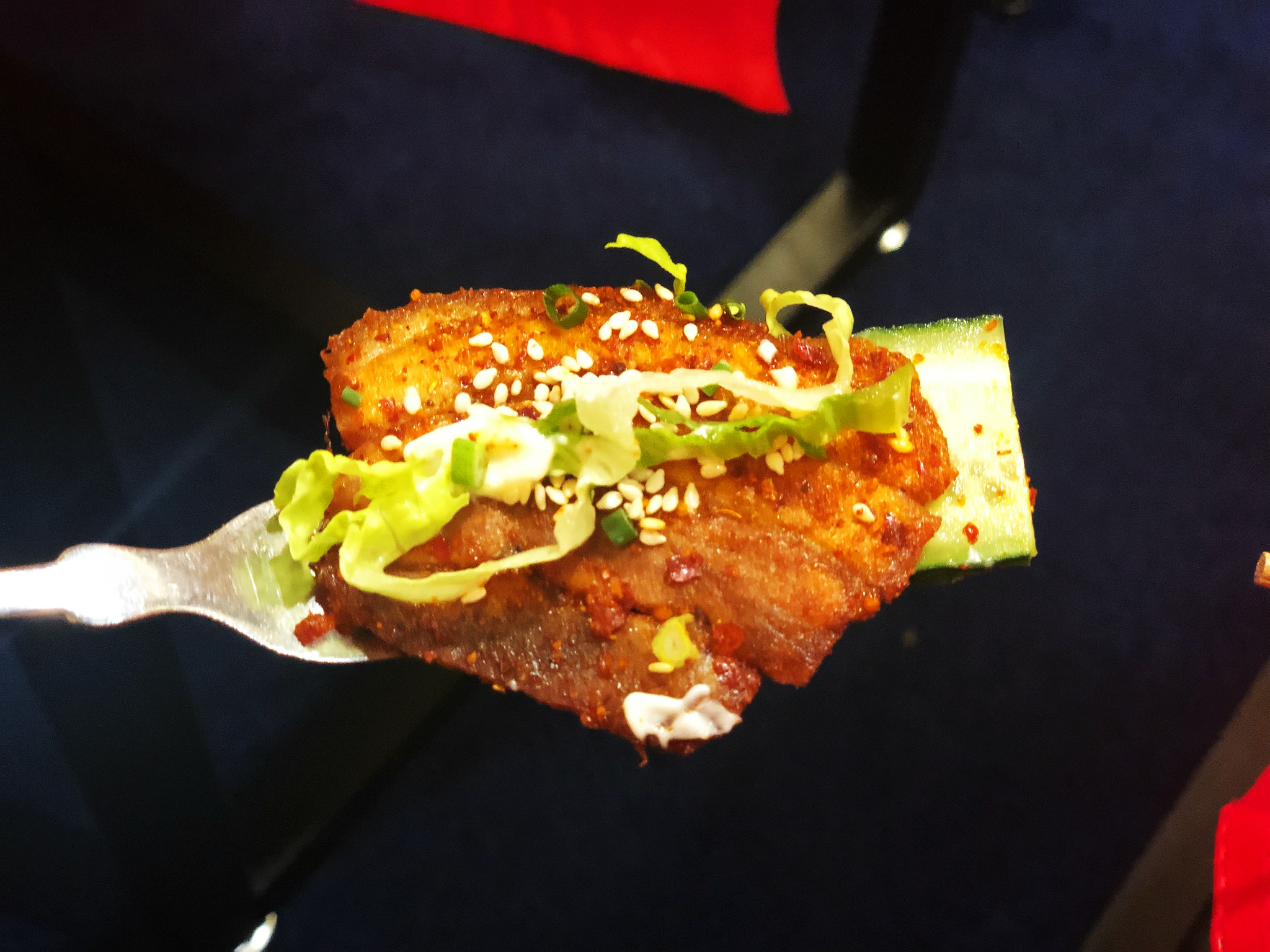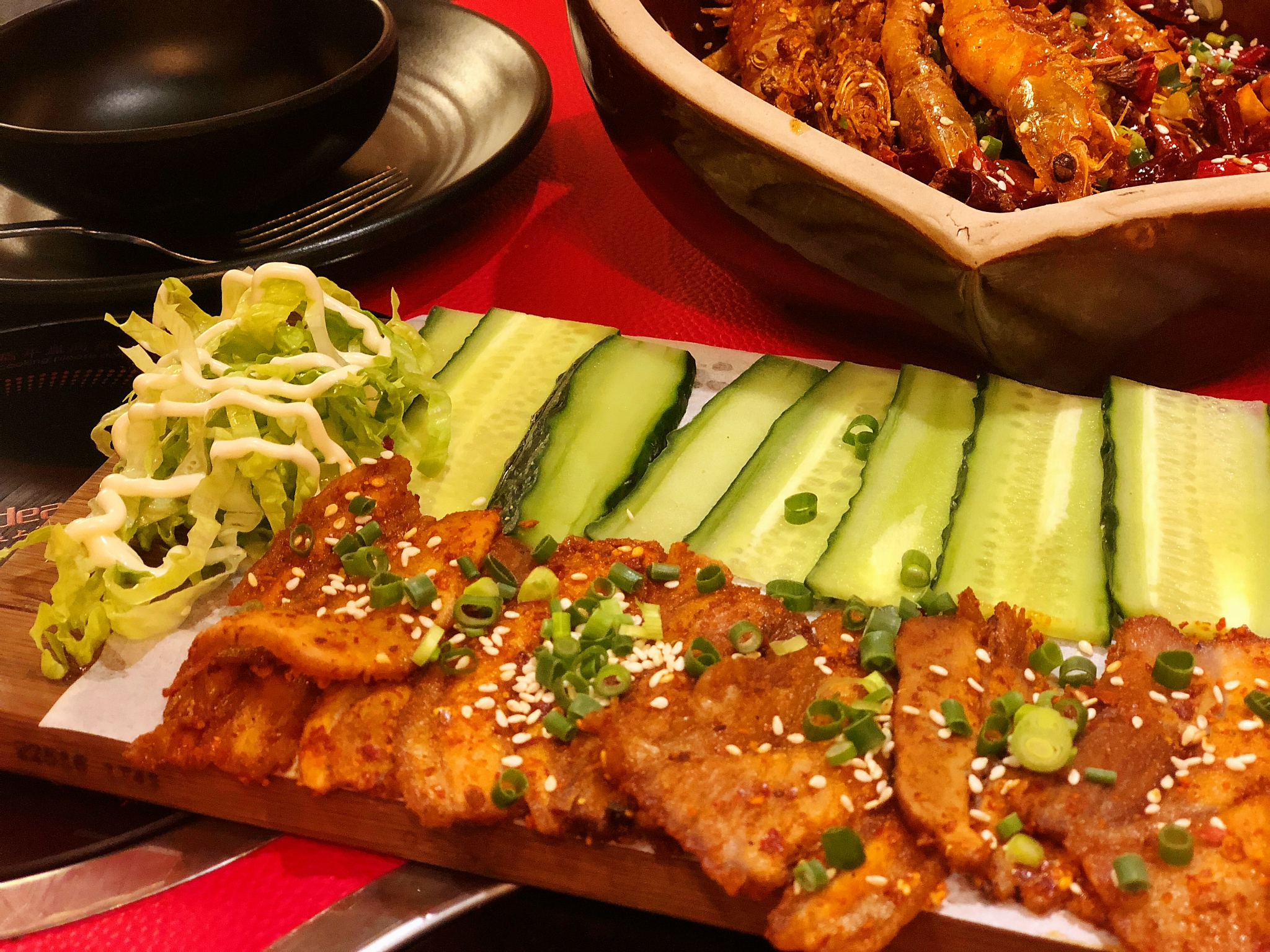 你见过黄瓜和生菜夹着五花肉一起吃的吃法咩?烹火家偏偏能遇到!这样吃的口感太奇妙了, 1 片黄瓜+ 1 片炭烤五花+ 少许生菜,这是什么神仙搭配,太清爽的口感了,一点都不会觉得腻,我一个人能吃上 2 份!