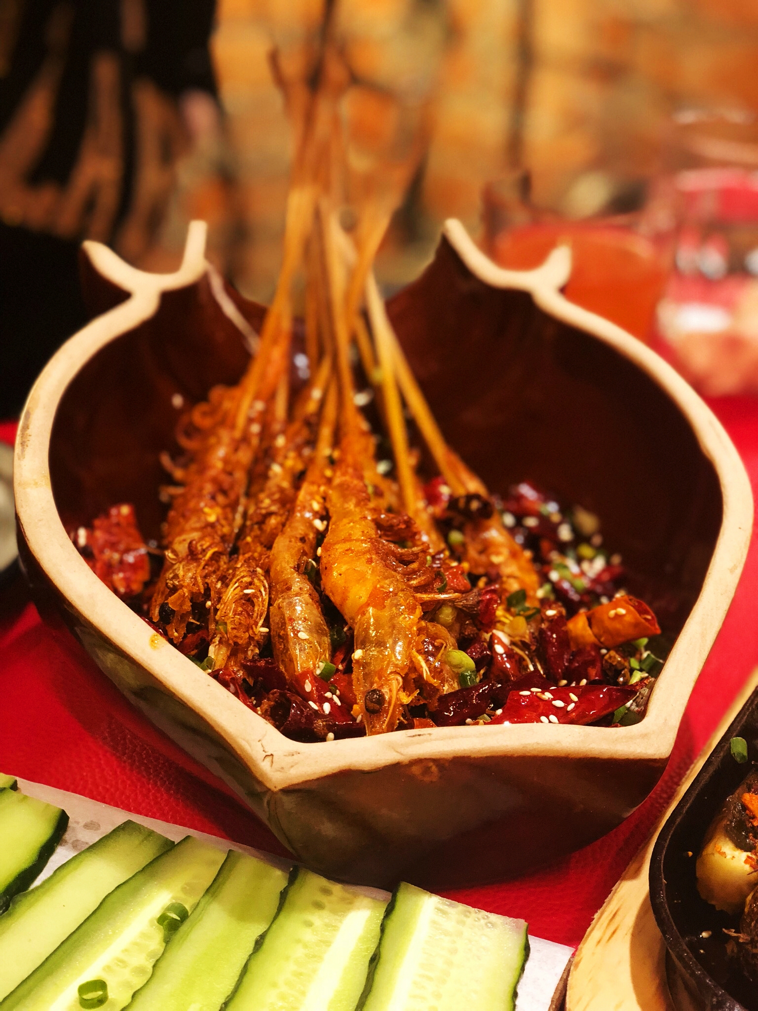 这道嘎吱嘎吱脆皮虾端上来香气扑鼻,把脆皮虾在装满调料的坛子里转一圈,开吃!!