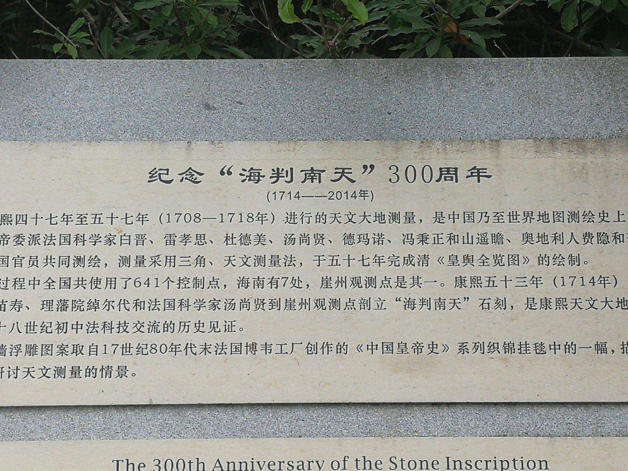 公元1714年,清廷派钦天监五官正苗寿、理藩院綽尔代和法国科学家汤尚贤到崖州观测点剖立“海判南天”石刻,是康熙天文大地测量的重要遗迹,成为十八世纪初中法科技交流的历史见证。