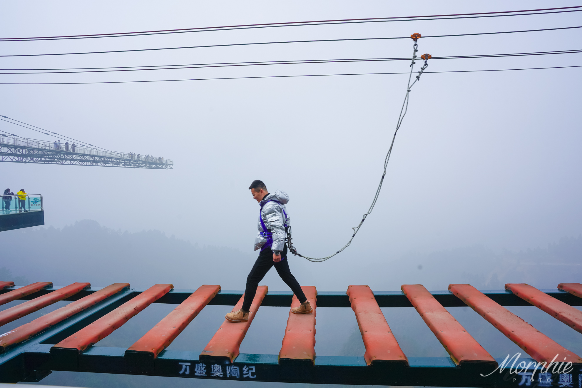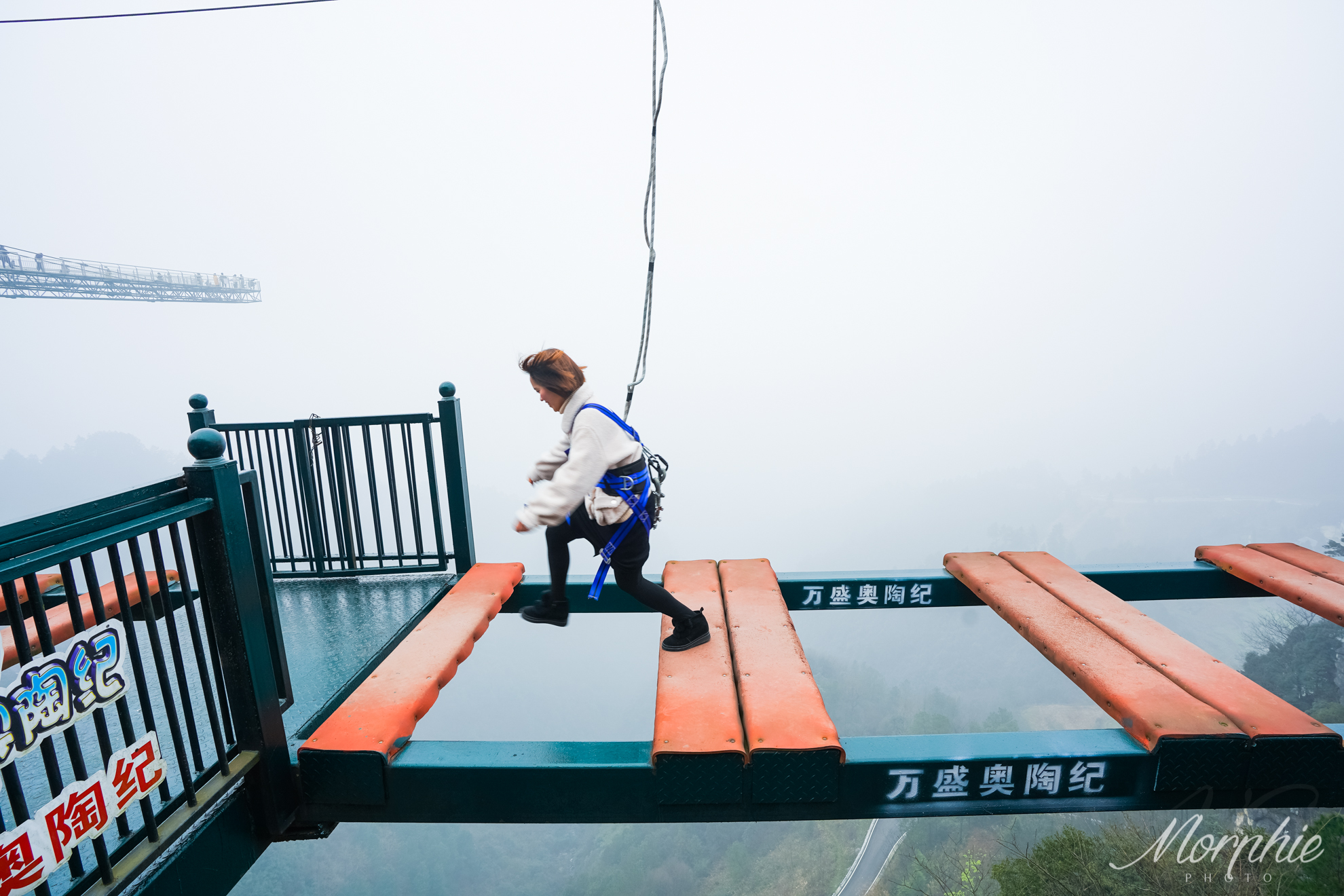 第二阶段的步步惊心,平均间隔大约30cm,没有护栏,需要有防护带保护。人被防护带悬挂在落差150米的高空中,脚下就是万丈深渊,脚步迈起来也并不轻松啊。