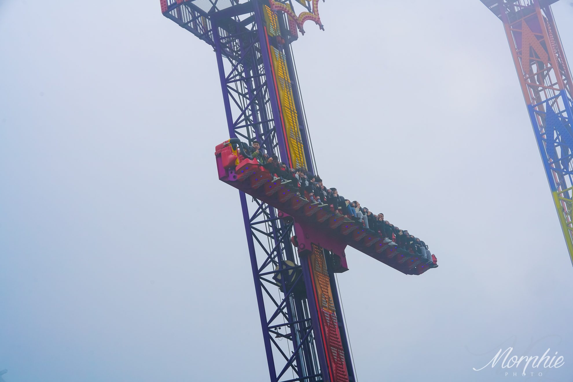 奥陶纪的跳崖机可是真的建在悬崖边上的,自身就有50米的高度,再加上悬崖那可就是超过350了~塔身上升到顶端后,看着脚下的深渊,蜿蜒的公路上,汽车小的就像一个黑点,感觉自己也是如此渺小。然而还没来得及感慨,垂直向下跌落的失重感就席卷而来,让人忘记了人世间的一切烦恼。