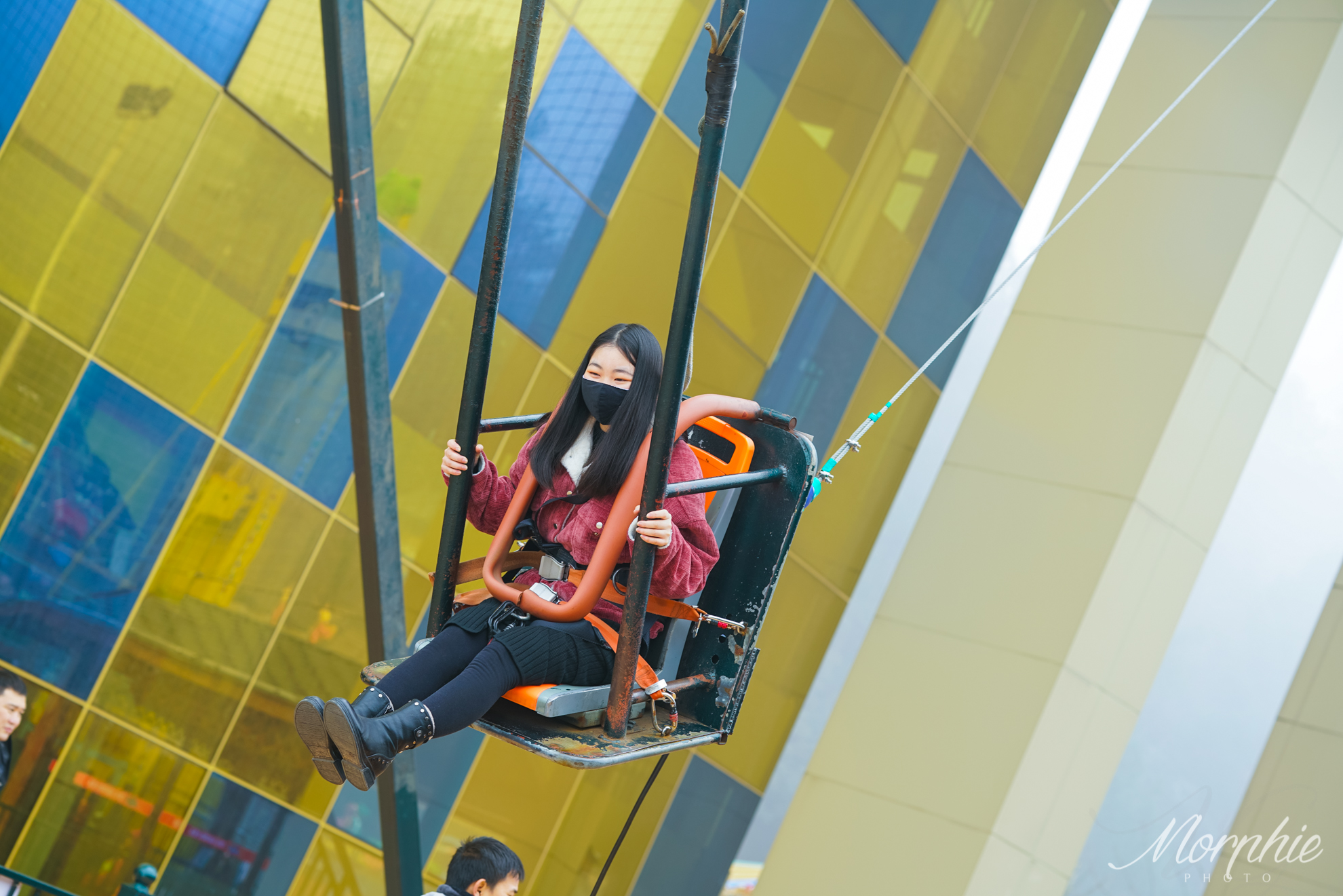 刺激指数No.1的悬崖秋千是重庆首创的高空项目,也是奥陶纪里尖叫声最多的项目,连英国的《每日邮报》报道过。目前在游乐园里的秋千共有五种不同的高度:21米、18米、8米、4米和6米。最高的21米还有另一个名字,恐怖秋千。本以为阴天应该人不会很多,但恐怖秋千和18米秋千的排队时间也要两小时开外了。于是我们决定先观望一下,真的,哪怕是在旁边看也要吓破胆了。