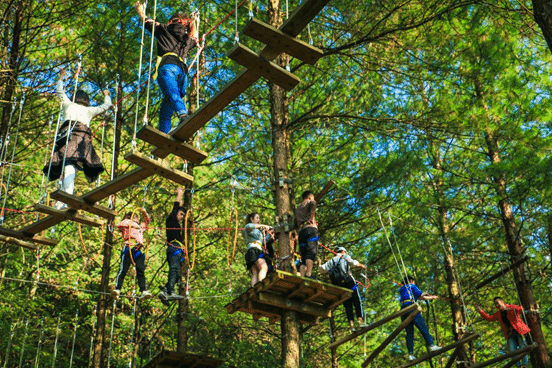 奥陶纪的丛林飞跃有6条不同风格的丛林飞跃路线,可以让体验者像人猿泰山一样从空中穿梭在大树之间,每两棵树之间的设置都不一样,难度系数最高的就是6号线啦,有兴趣的小伙伴可以尝试挑战~