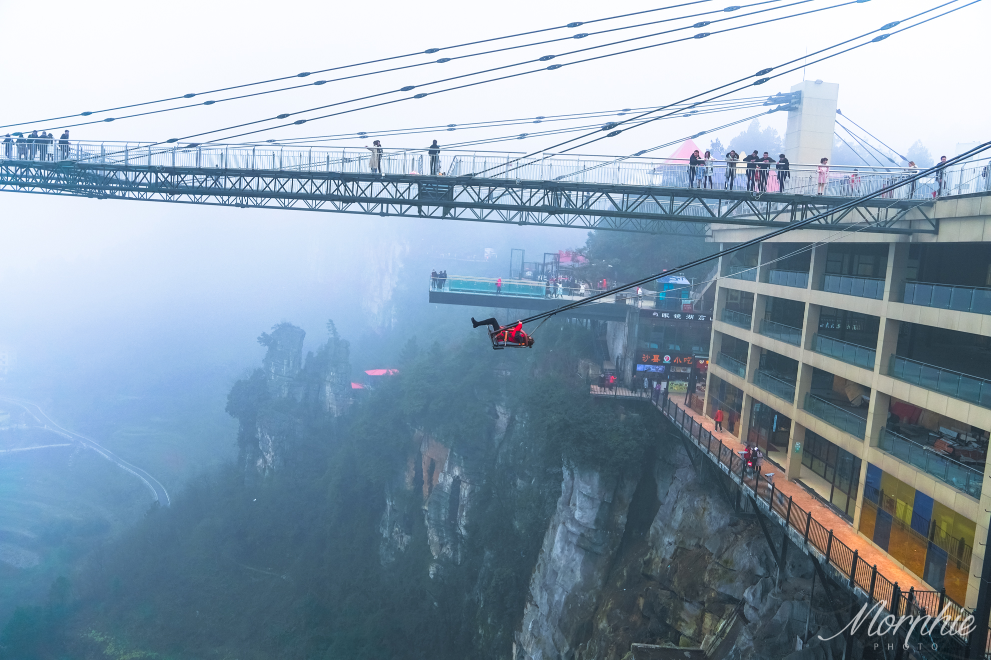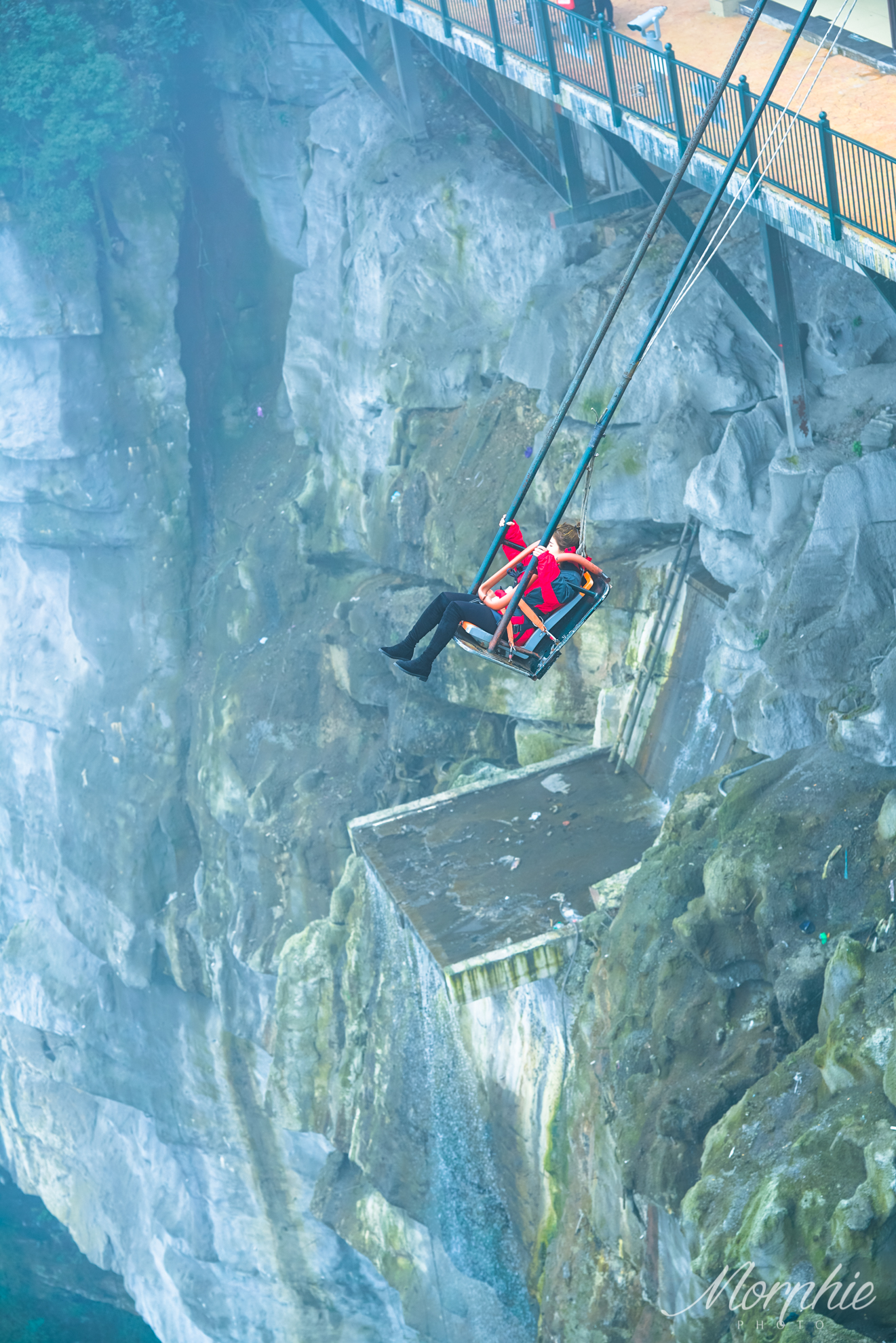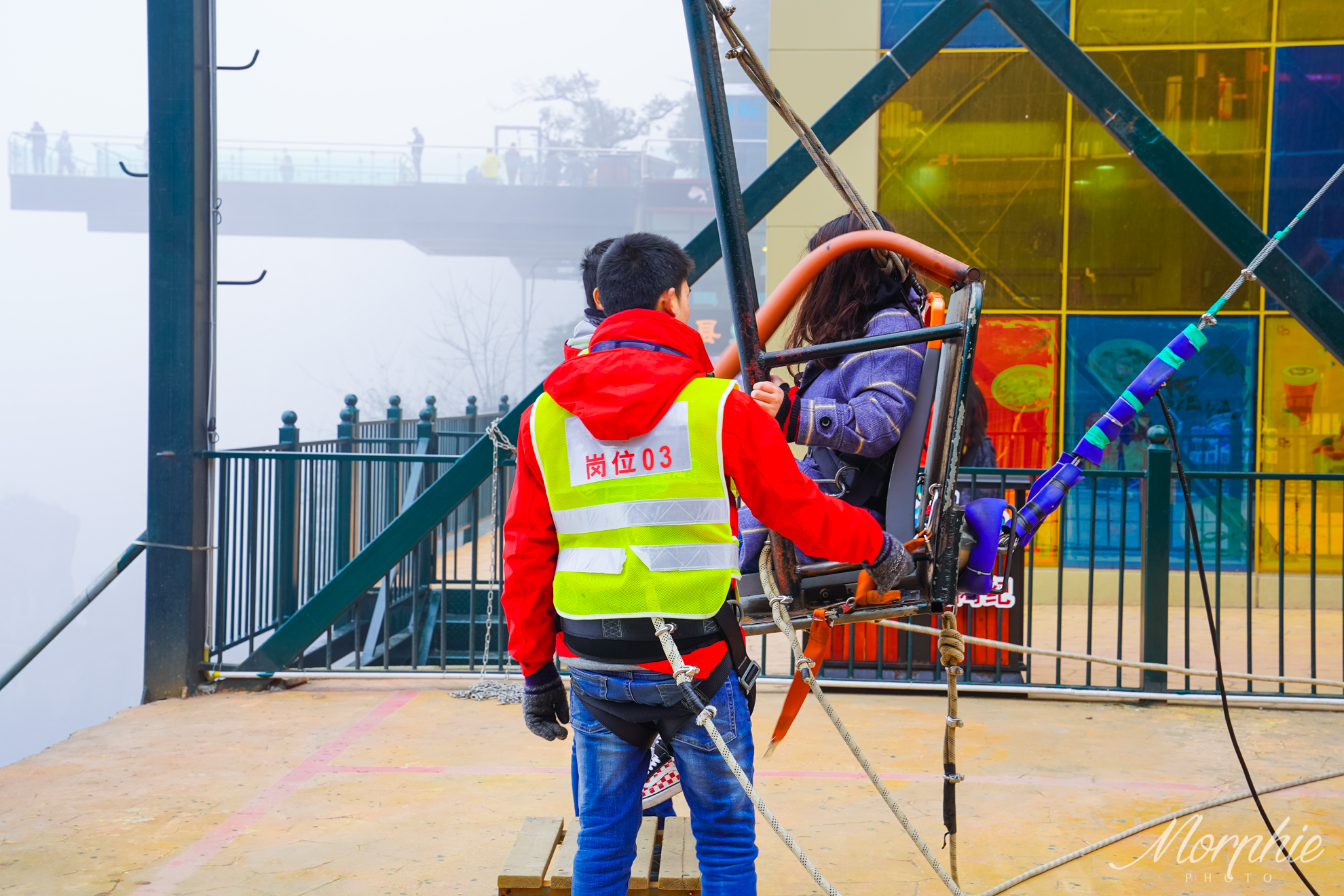 λ 纠结于排队时间的小伙伴,可以选择去4/6/8米悬崖秋千。4米用人力来推,6米和8米是机械动力。其实也是修建在数百米的悬崖边上,也是把你拉到与地面垂直90度,静止几秒后放飞,向前向后都能荡到与地面垂直90度,相当于180度来回荡了。虽然高度不及前面,但也是很刺激的,而且排队的人会相对少一点。位置在玻璃吊桥附近。