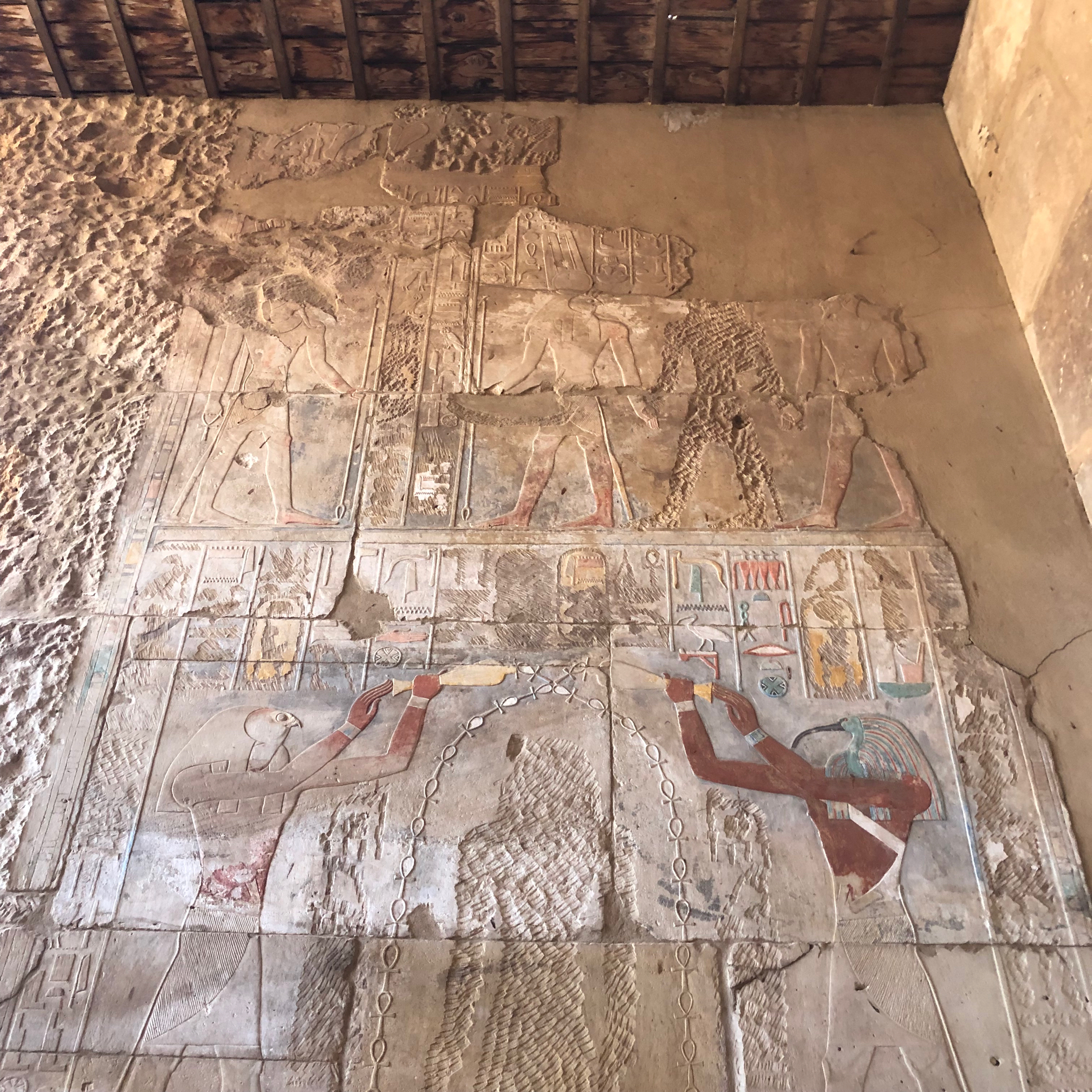 下方立着法老国王,寓意化身公羊的阿蒙神庇佑国王。