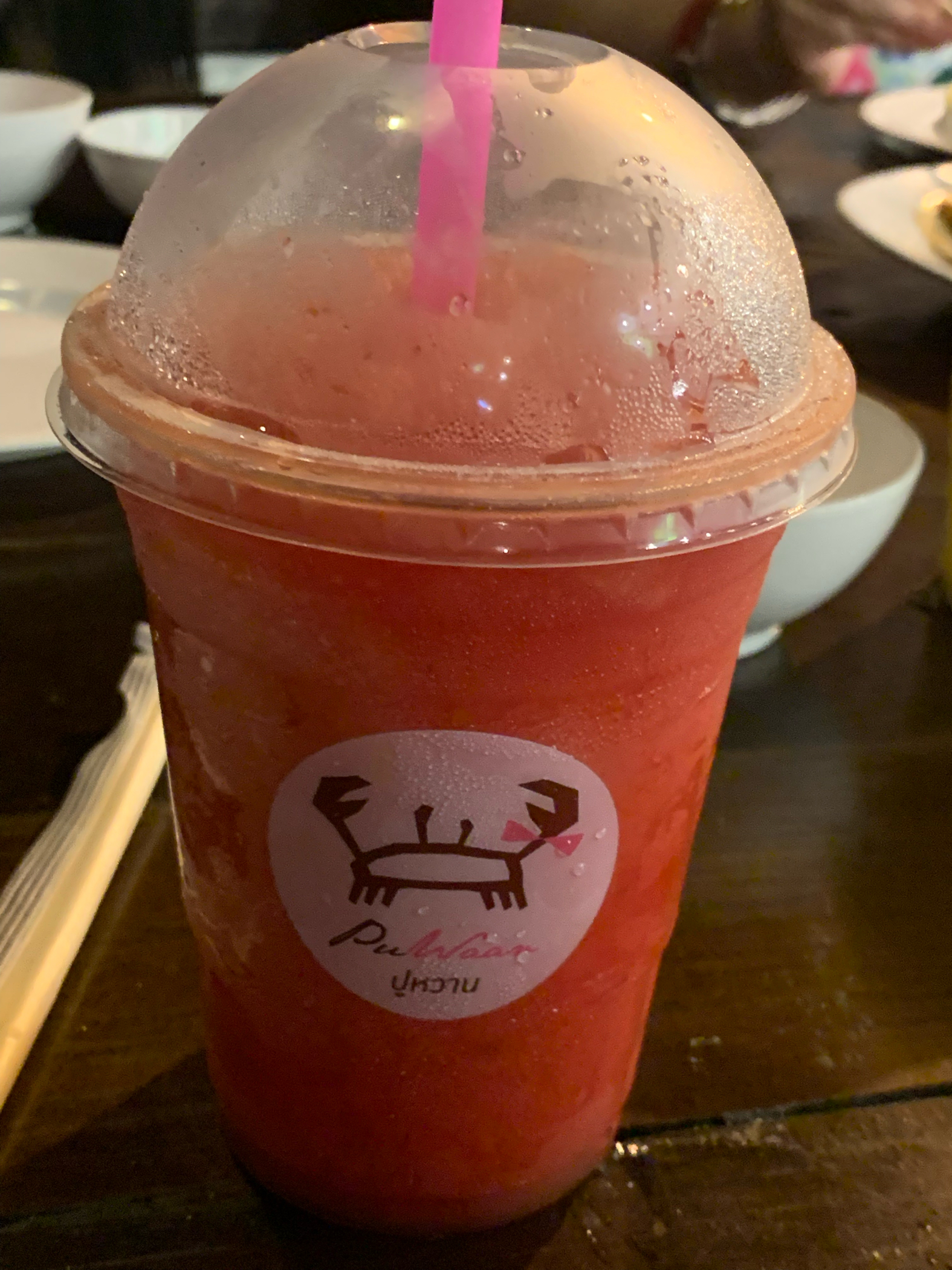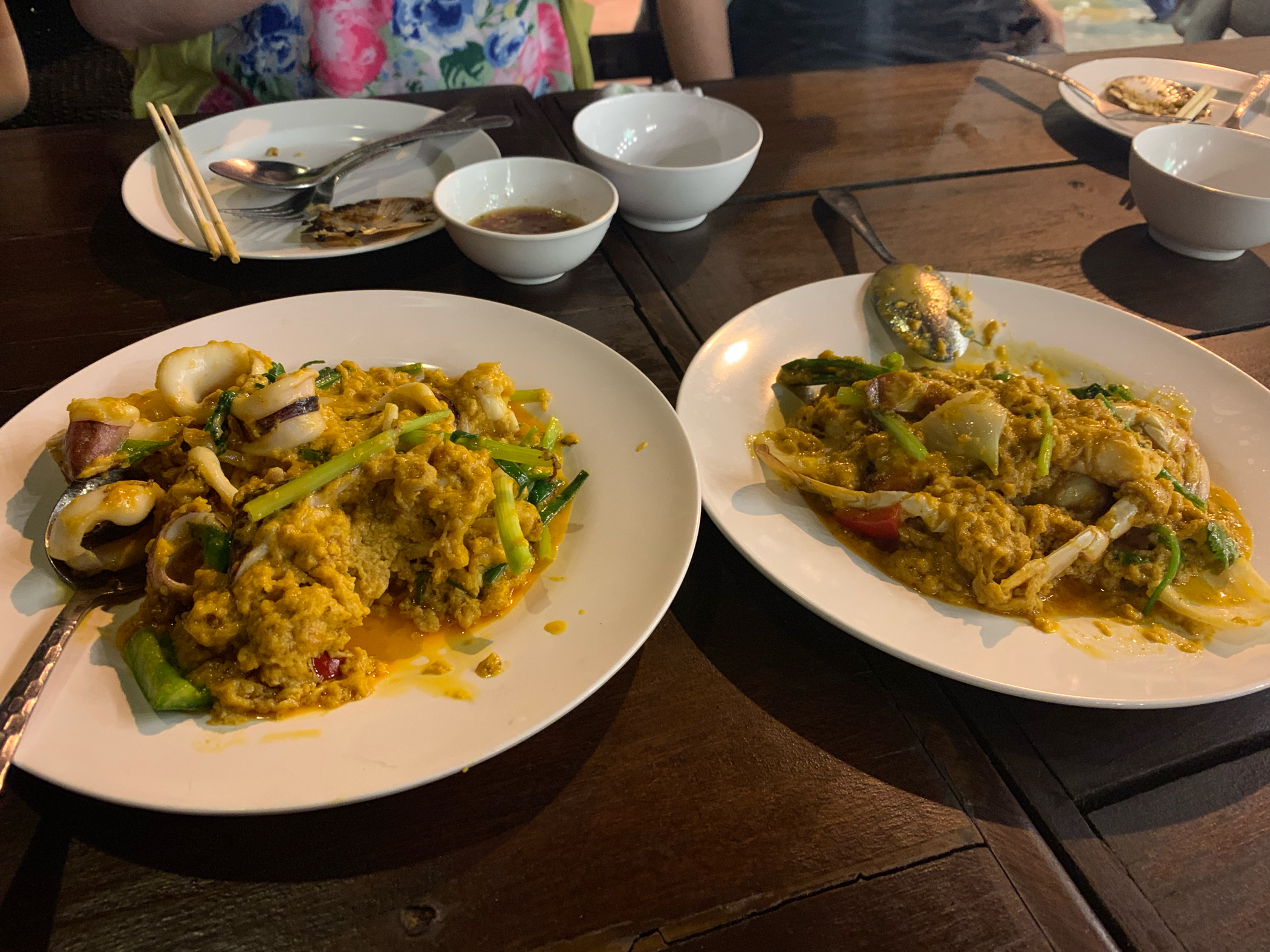 对不起,又忘记拍照了……咖喱蟹、炒鱿鱼、1kg基围虾、酸蓉扇贝、果汁3杯、啤酒2杯…1800B,还是挺便宜了吧