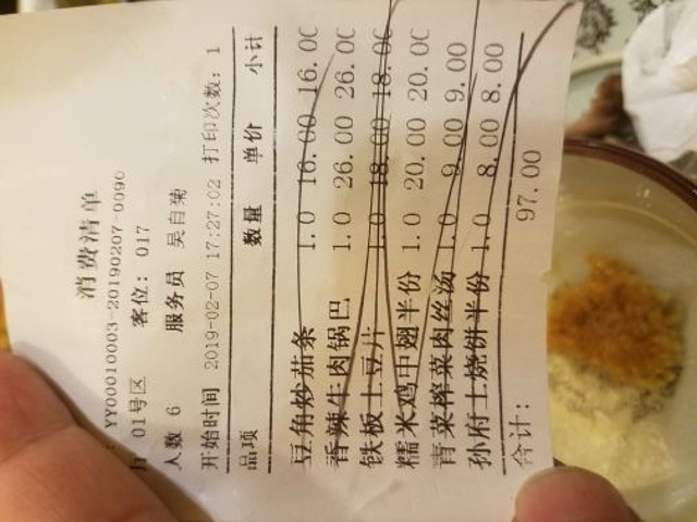上楼需要坐电梯,和另一家ktv是共用一部电梯,在五楼,电梯入口在拐角的一个小厅。 位置很多,装修的不错,一进门是海鲜池,可以看着点菜,也可以要菜单点菜。 我叫了铁板牛肉,豆角炒茄条,糯米鸡翅,土烧饼,榨菜肉丝汤,柠檬冰红茶,味道都很好,就是那个牛肉锅巴吃不来 浪费了,不过看当地人的点餐率很高。 服务员服务都很好,有个胖胖的大姐捡到了老婆的手机,还给我的时候还要我打个电话验证是我们的,我觉得很好。 菜色都很大份,能点半份的我都叫半份,我们两大两小都吃不完。最后还叫了半份(6个)烧饼打包回酒店,真的很好吃。推荐推荐!!