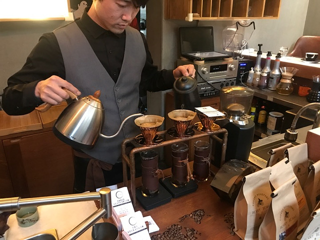 年前几天在前门喝的几家咖啡店是不停的踩雷,郁闷死~ 二楼小天台空间不大,挤满了拍照的姑娘们连个下脚的地方都不好找,让人无心赏景。冬季的小院也不适合坐人,安心坐在一楼吧台喝我喜欢的手冲咖啡,可惜这味道实在是糟糕,堪称在北京喝过最差的之一。 【最让人心烦的是点单后,咖啡师炫技般双手同时冲泡两杯咖啡(当时点手冲的客人并没让他忙到需要同时冲泡两杯),一入口却像刷锅水……】 可能说刷锅水过了点,我点的「巴拿马詹森庄园艺妓日晒」(一般大家更喜欢叫它瑰夏)和音乐家系列的「哥斯达黎加贝多芬水洗」。入口毫无香气,更无什么纯净口感可言,可以说极其失败,烘焙的豆子本身就不合格。 作为网红店房子环境是有的,只是产品太让人失望了!没有那个双手炫技我可能给两星,莫名其妙炫技却如此难喝,再扣一星!