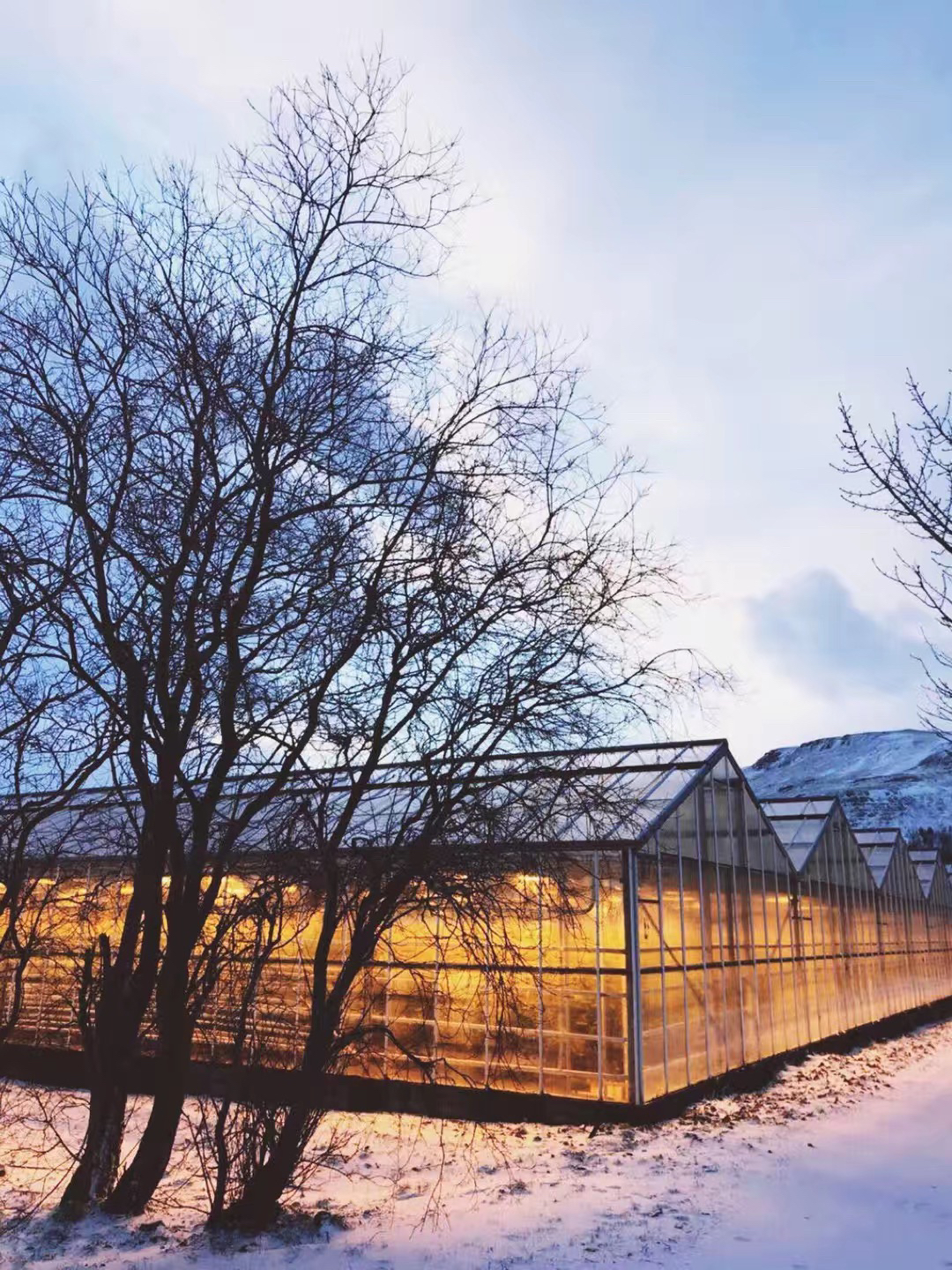 去往黄金圈的路上 突然下起了鹅毛般的大雪 司机觉得雪景特别美 就非常nice的停下来让我们拍照 玩high的我们越走越远 越无意间发现了一道柳暗花明 灯火通明的暖房连排连排的突然乍现在我们的视野里 壮观极了 在雪景的映衬下就如同童话故事里的玻璃房 一位培育大叔走出来 还邀请我们参观了里面的育苗 温暖又震撼