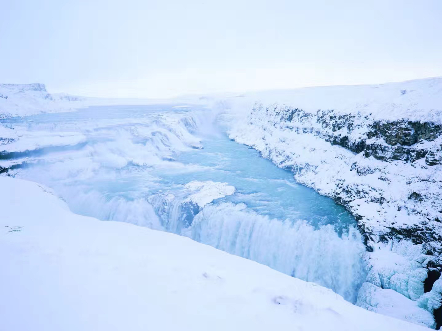 黄金瀑布是冰岛最为壮观的瀑布之一,水量丰富、造型独特。瀑布分为两层,雄浑的瀑流跌下两层阶梯,滚滚流入古老的峡谷。