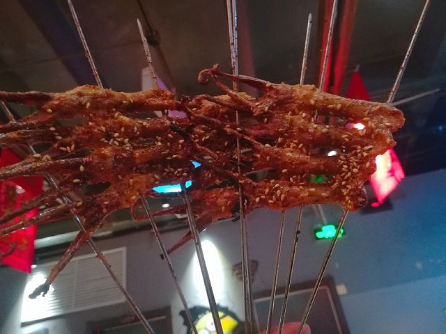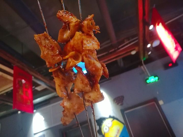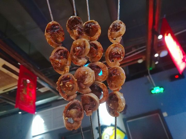 小味串店是爱建特别火爆的一家烧烤店,每到饭点儿必等位。 |茶缸肚^茶缸肚几乎是每桌必点的一道菜,我们人多一共要了三缸,非常受欢迎,几乎没剩。 |彩虹沙拉^在坐女士们最喜欢的一道菜,一盘没吃够,又要了一盘,味道非常赞。 |老虎菜^下酒的好菜,比较有特点的是老虎菜,还配了一盘干豆腐,可以卷着吃,也是上桌后秒没的菜。 |心管夹肉^肉串里面最受欢迎的一个品种,反复被点了两次,感觉比羊肉串牛肉串都要好吃。 总体消费感觉还是不错的,就是烤品比较慢,还有点餐后上错品种的烤串,可能是宾客太多的缘故,菜品味道不错,我们十八个人消费将近1900元,性价比平平!