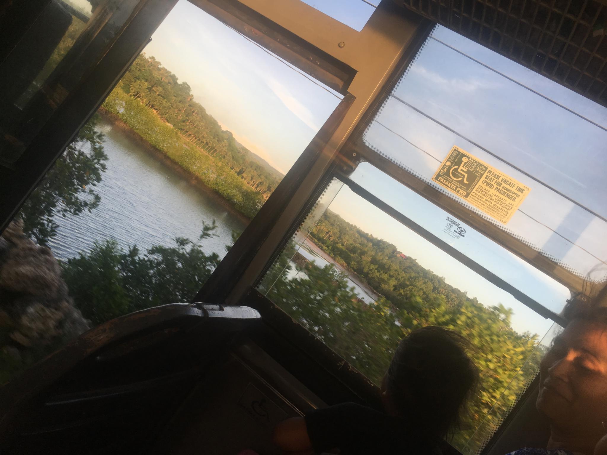 四个多小时从农村开到城市的公交车,沿途风景很美。路上停车时有小贩上车兜售吃的喝的,香蕉片一定要买啊,20比索(人民币3.5)一小包,好吃死了,现在都想念。日落后都睡着了,被四周汽车喇叭声吵醒的时候已经到宿务市内了,一睁眼已经车水马龙,也看不着树的影子了。