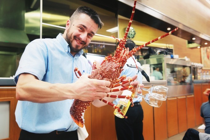 老哥特别高兴的给我们展示着一会儿就要成为我们盘中餐的澳龙。手臂上健硕的肌肉线条总感觉这些服务生白天其实是水手,亲自下海捕捞,晚上再来到餐厅中烹调售卖。
