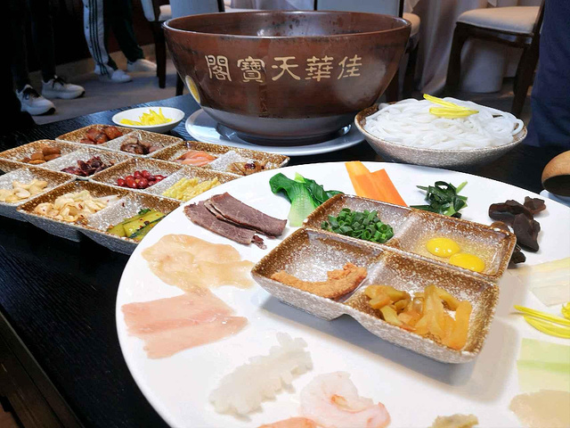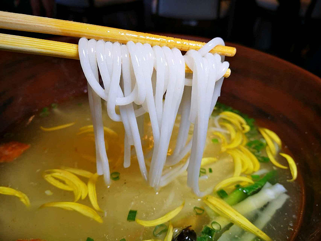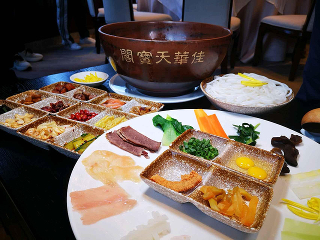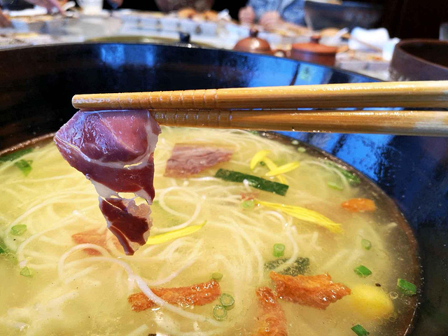 吃过很多家的过桥米线,佳华天宝阁·国宴过桥米线倒是头一回吃,米线滑爽,汤醇厚香浓,又带着一缕鲜甜,味道真是不错,此外很多地方都看得出五星级酒店的高标准和用心,呈汤的碗是专门定制的建水紫陶碗,很有档次;定制的筷子还专门做了防滑处理,这样夹起米线很顺手,不易滑落。