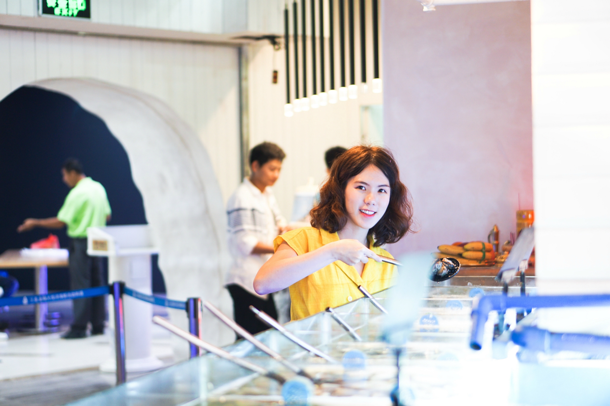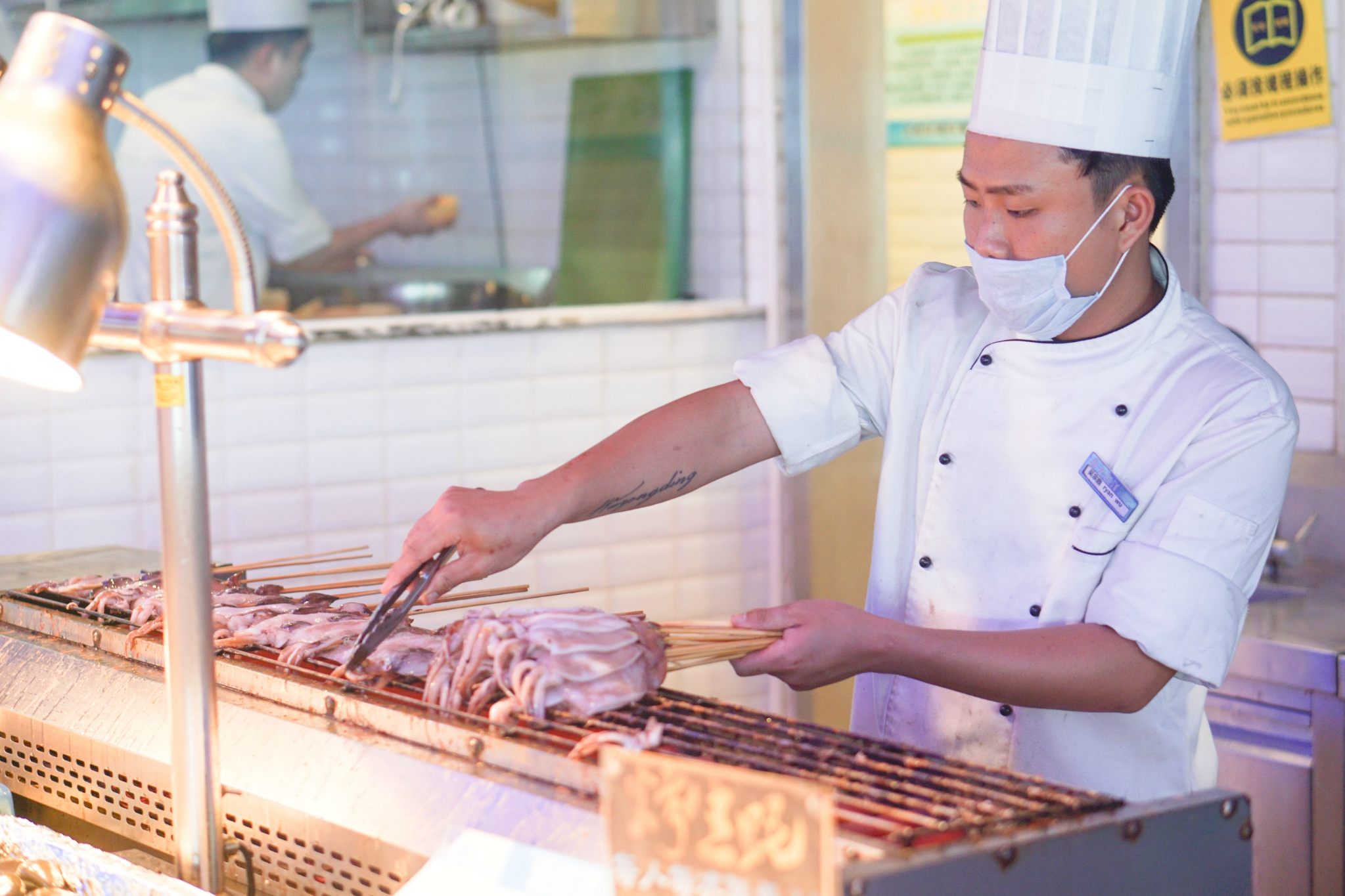 如果肚子饿,想吃熟食垫垫肚子,可以去熟食区挑选食物。寿司、肉食煲等等各类美食,还有师傅现烤海鲜、串串。听着啪滋啪滋的油锅声,闻着那肉香味儿,足够能驱使一堆吃货前行。