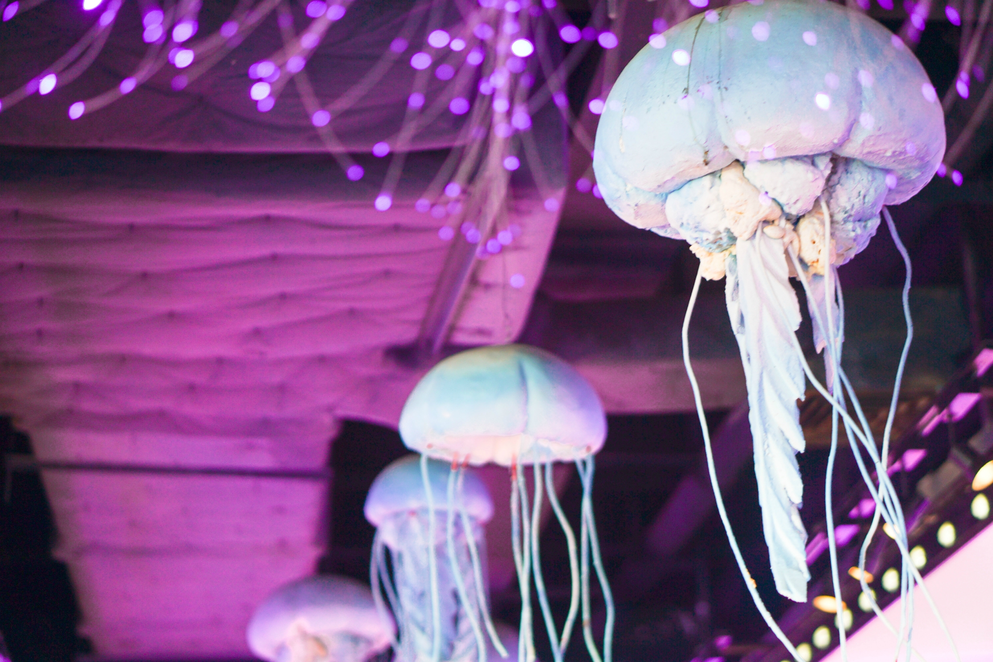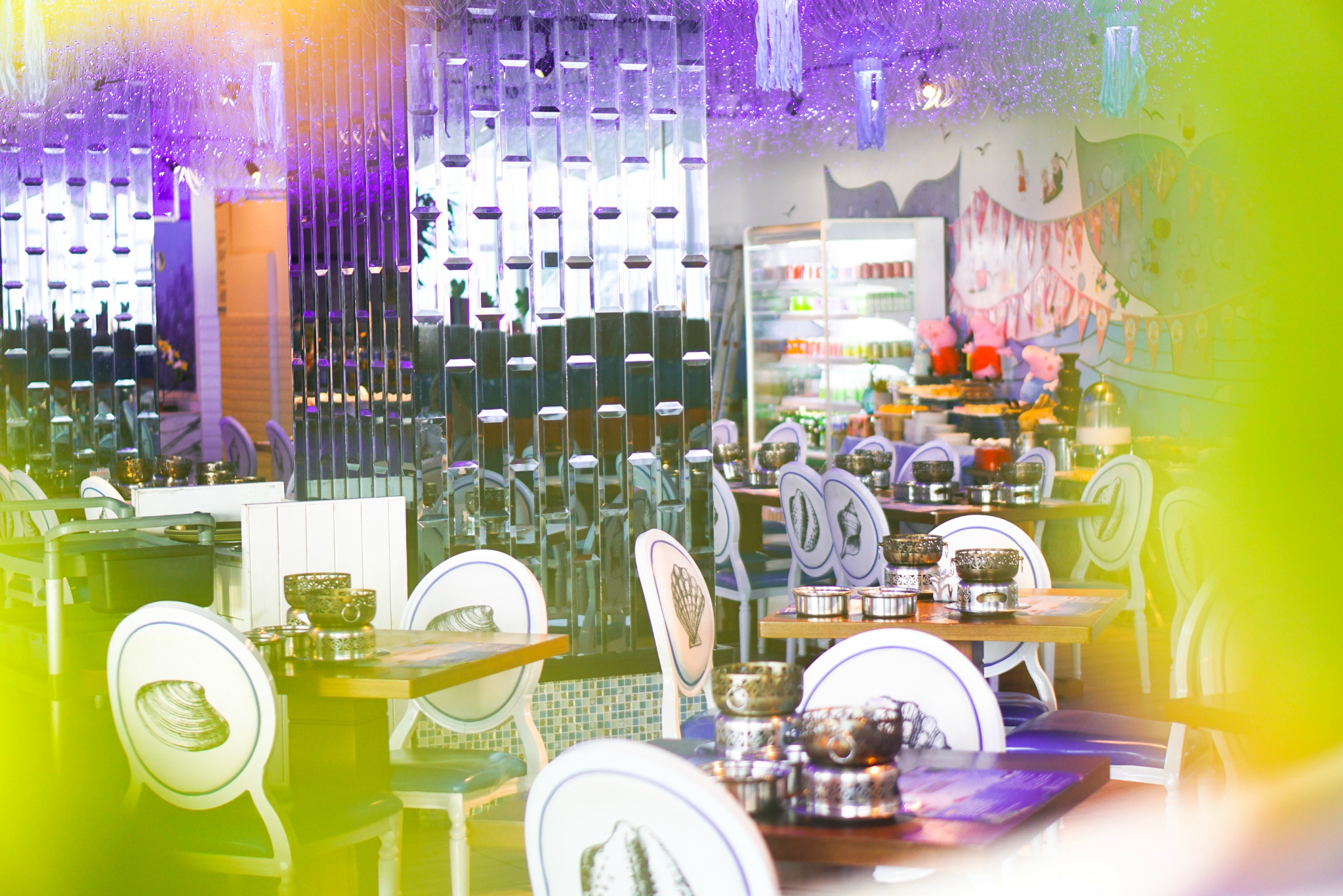 眼前的大堂,有卡座也有台座,十分适合三五朋友聚餐。一到晚上,灯光就会微微亮起来。餐厅采用了高科技3D全息投影技术,打造了一个蓝紫色的灯光世界。微微闪烁的灯光,仿佛整个人进入了海洋深处,十分梦幻神奇。抬头一看,头顶上还有水母和各种可爱海洋小生物。