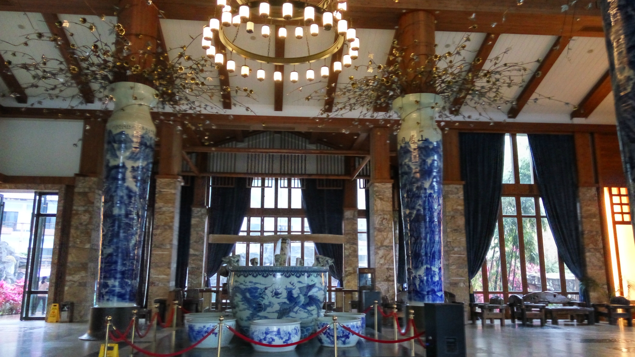 酒店大堂让人眼前一亮,大堂立柱是四只全国最高的青花瓷瓶,青花瓷旁,还雕绘着神圣而庄严的敦煌壁画,古色古香