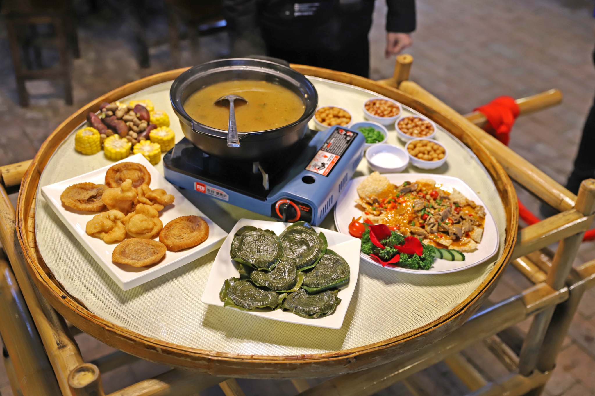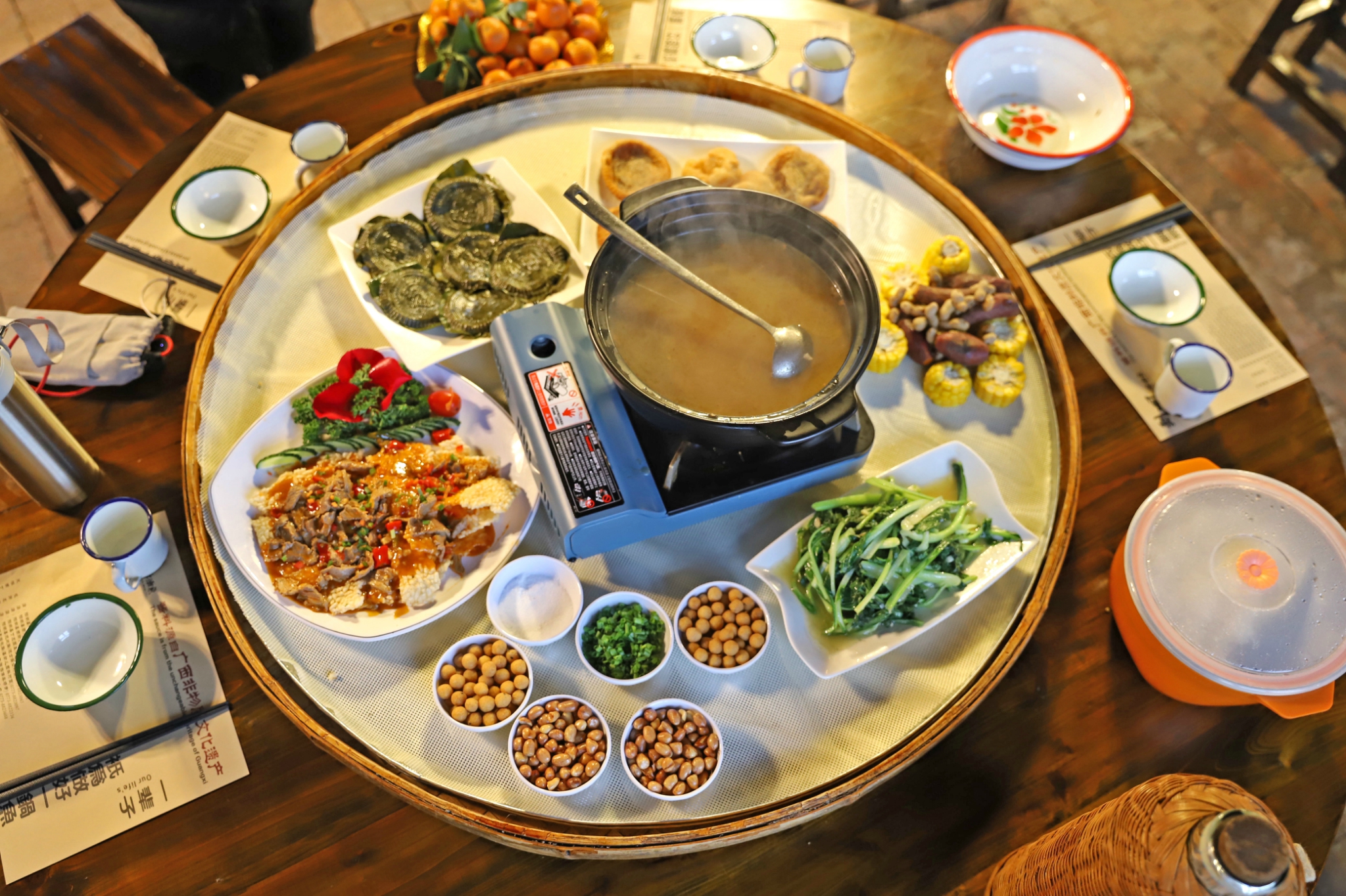 上菜的方式也很特别,要用小娇子抬出来的哦,仪式感满满。簸箕宴配上地道的油茶,喝一下马上觉得暖乎乎的,茶汤配上米花、酥花生、炒米、葱花等,入口后初觉是茶叶的清苦,过后便是甘醇鲜香,令人回味无穷。