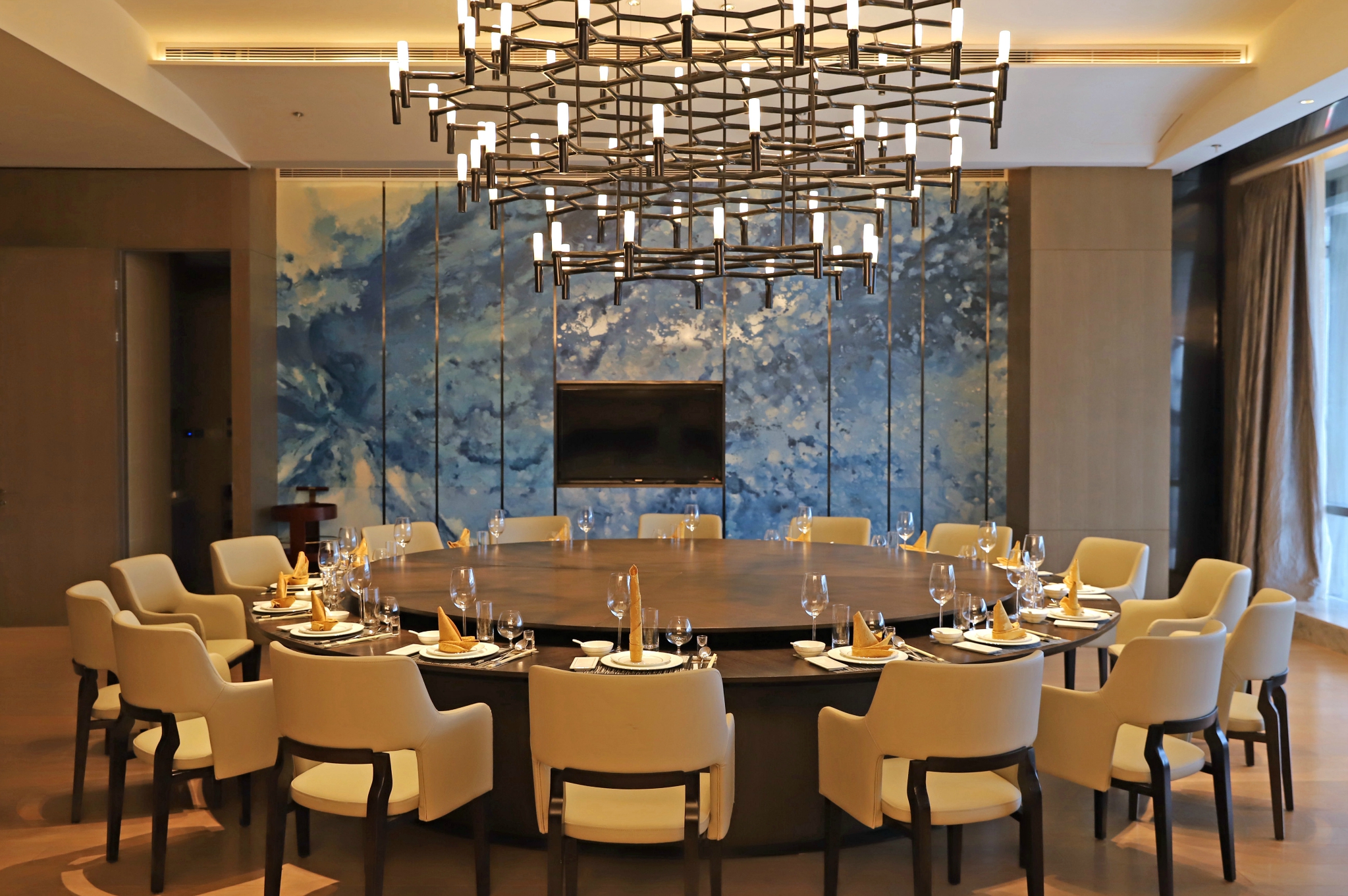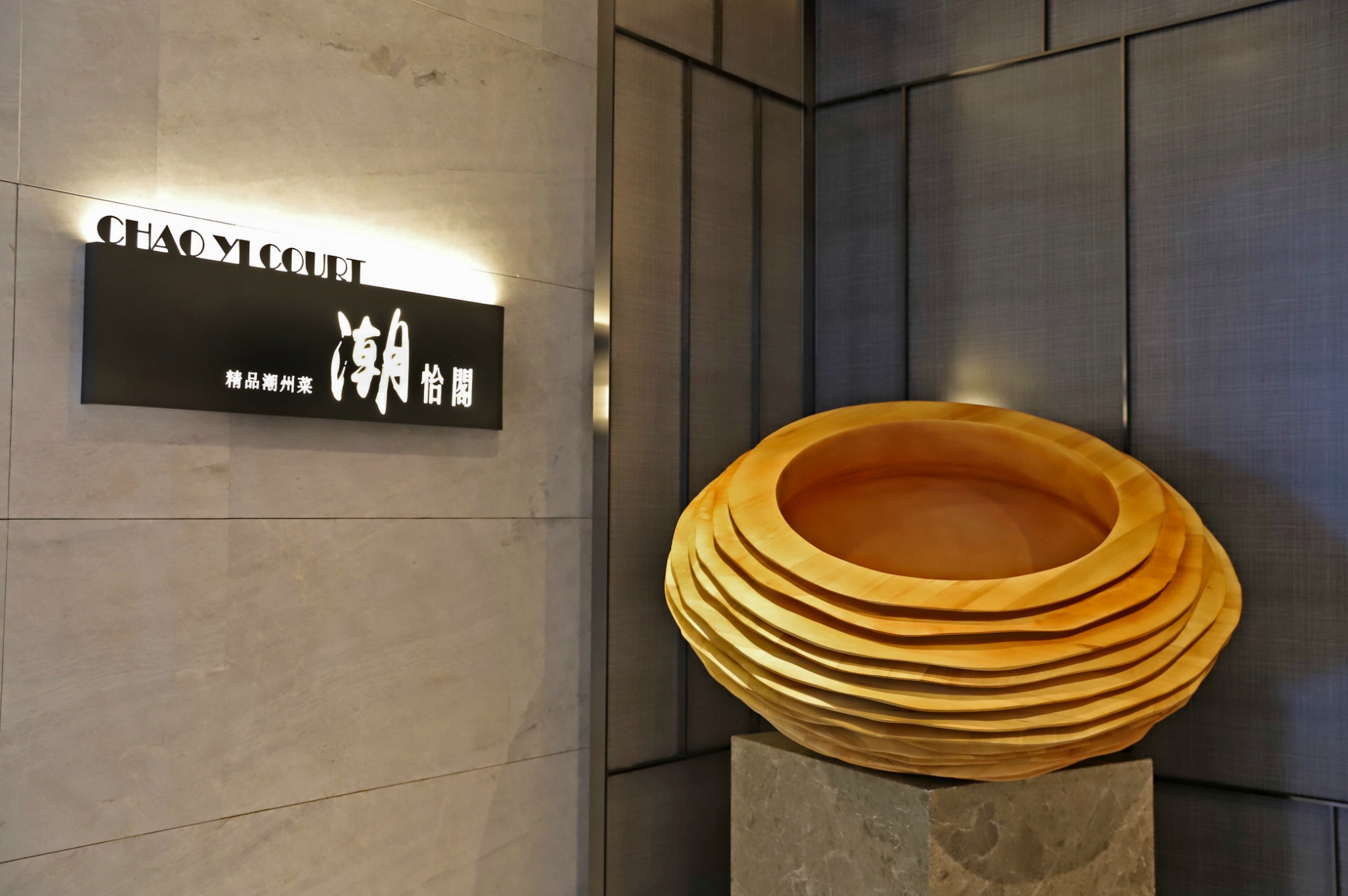 潮怡阁,一家精品私房菜,潮怡阁的潮可不是潮流的潮,而是潮汕的潮,名副其实,这里吃的是潮汕的私房菜。从酒店大堂的旋转楼梯上来,看到的就是图2这个位置,这个艺术摆设应该是寓意一个盘或者大碗吧?
