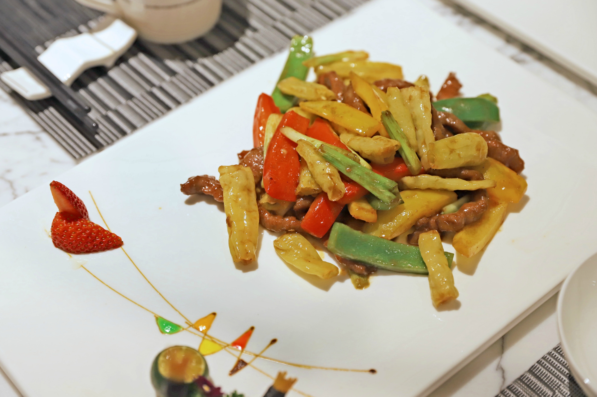 这道菜有点辣,因为用的是泡椒,但是掩盖住了牛肉的膻味,牛柳非常嫩。没想到这么简单的材料,也能化腐朽为神奇,色泽搭配很诱人,摆盘做得十分精致。一顿饭下来不仅是慰藉了我的胃,眼睛也满足了。