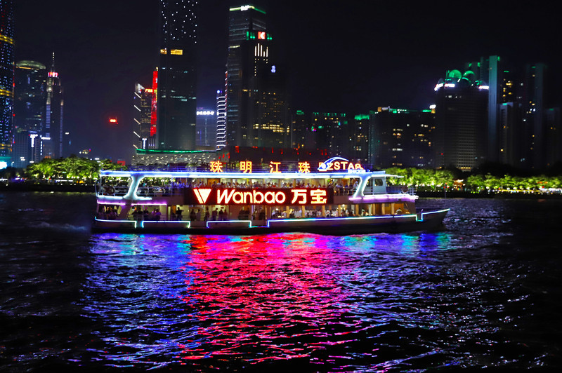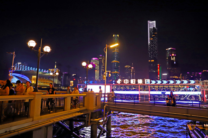 游船分别从大沙头码头和天字码头起航,路过码头时刚好看到游船靠岸下客。除了游船,在珠江边行走,也可以再岸上观赏游船show,一艘艘颜色各异,形态万千的游船在江上行驶,也在这江水映照得五颜六色,色彩纷呈。当中要数这艘金色的南海神最出众了,金色的船声特别亮眼,打造得好像一个财神爷的形象。