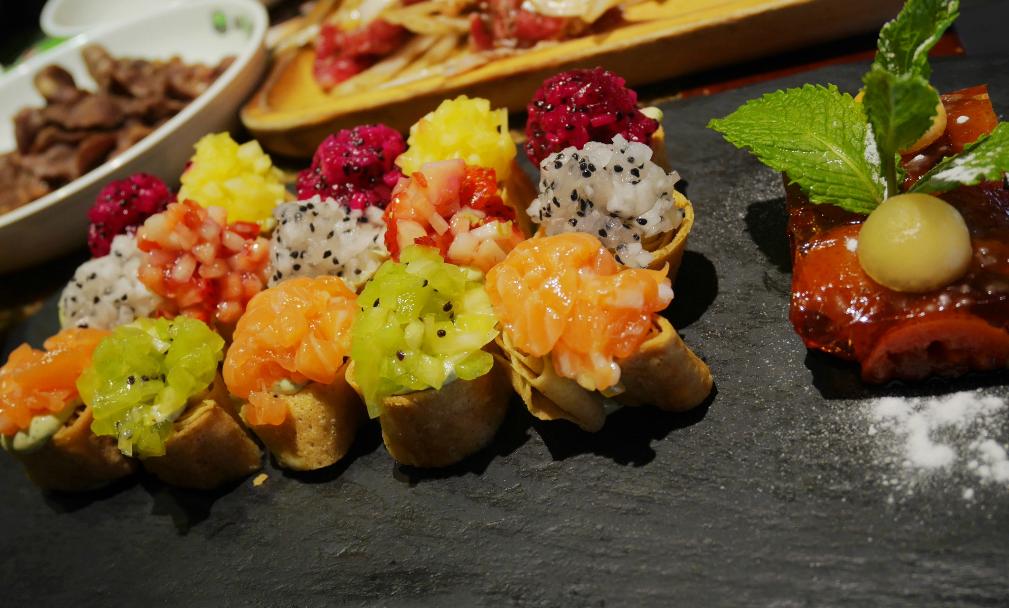 咯吱花,有水果和三文鱼,底部是类似煎饼的东西,口感很有趣,外形也很好看,是女生们会喜欢的菜品,改良版的寿司。