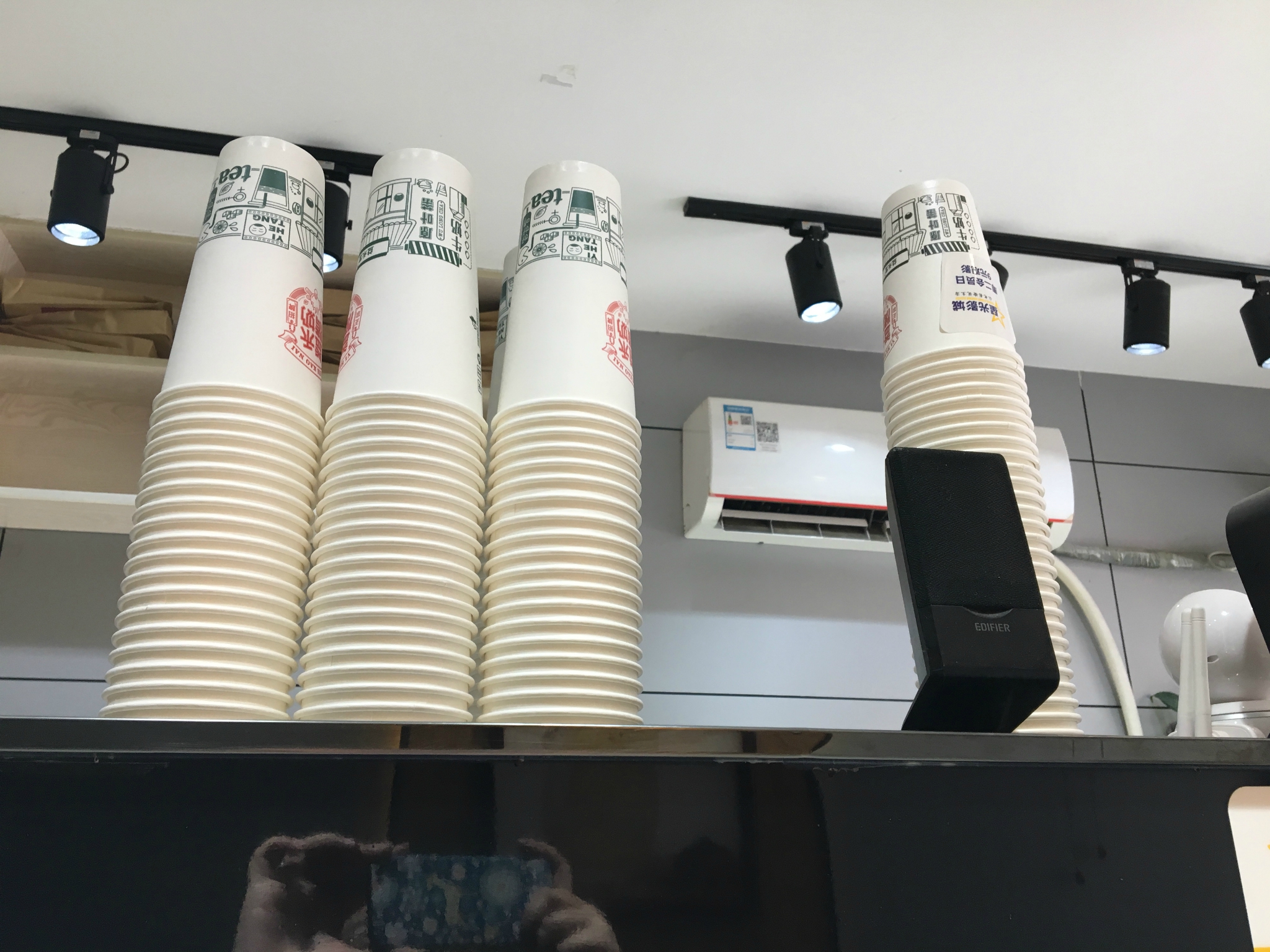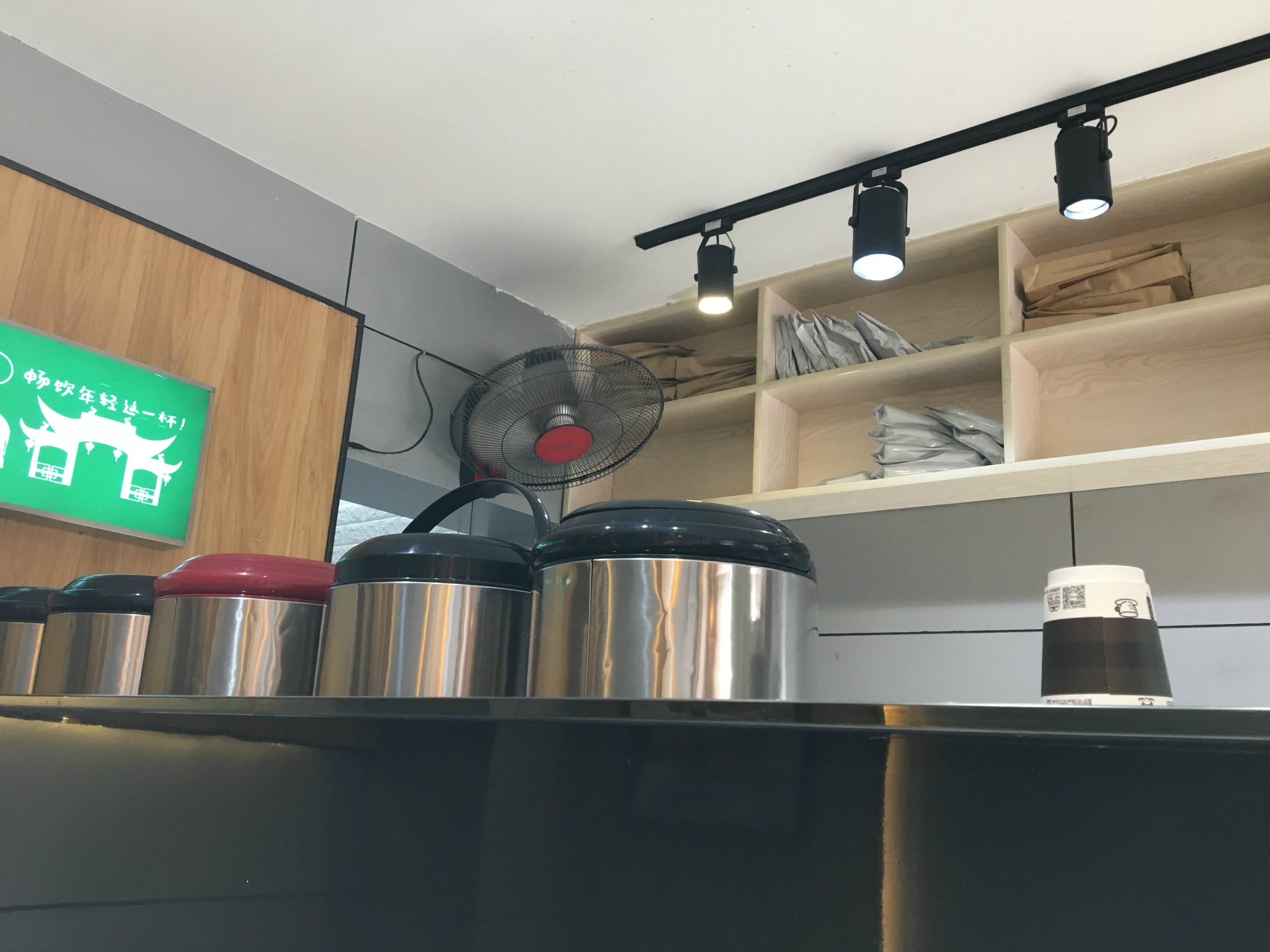 店铺面积比较小,外面的门面不足15个平方,但是这么小的地方,仍然设置了几张桌子让客人在等候奶茶制作的时候有地方坐着休息一会,算是不错的啦。连锁奶茶店的装修都是经过设计的,所以看起来干净整洁小清新,符合现在女孩子们的审美。
