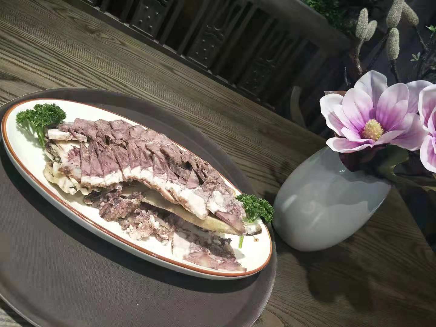 酱牛肉是它们家的特色菜之一。用的牛腱子非常好,味道很香,很有嚼头。聪聪作为业余美食爱好者,问了他们到底怎么烹饪的。具体我已经记不清了,就记得是五种香料。