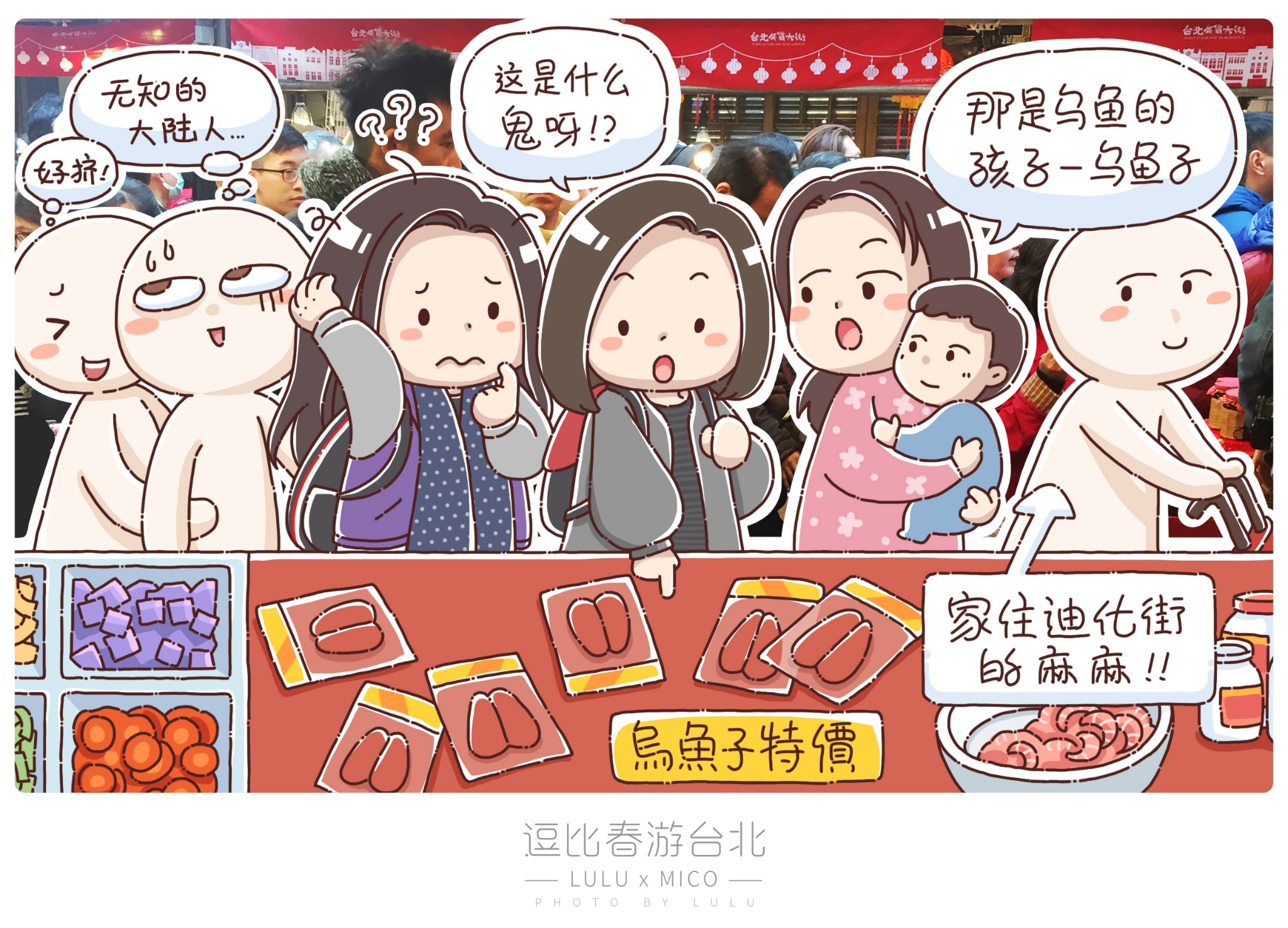 在年货大街里凑热闹的我们,对各种没见过的食物充满好奇,哈哈哈,不过友善的当地人也会热心的和我们介绍当地的特色产品~其实大部分的 台北 民众都是待大陆人非常和善的,这是事实。